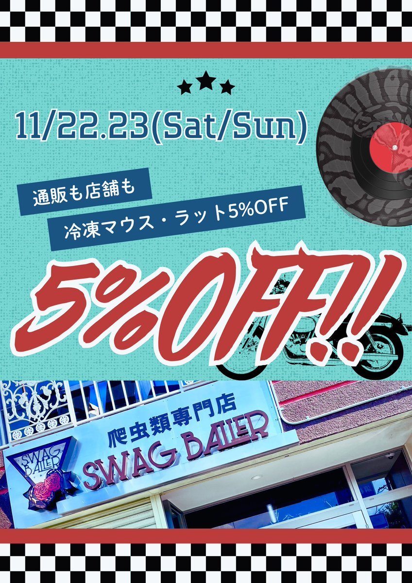 ◤🐍🎊-餌5%OFF開催-🎊🌹◢ 今週末11/22(土)23(日)は…⏬ \\🐭冷凍マウス・ラット🐭// 餌だけ❕1匹からのご購入で… 5%OFF開催😎💥 新入荷生体&SWAG CBと一緒に🤝🏻 皆様のご来店、心より お待ちしております🚘💨 #ボールパイソン #ballpython #爬虫類 pic.x.com/d8xhJLWPg5