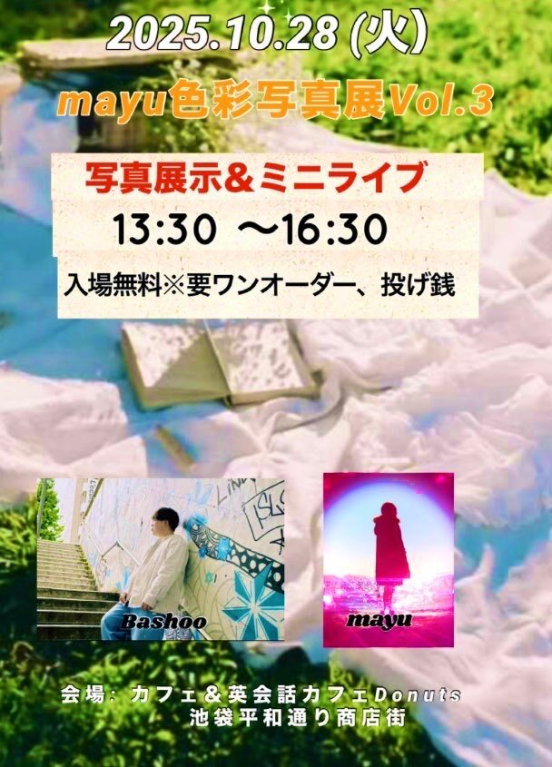 本日です!! 「mayu色彩写真展vol.3」写真展示&ミニライブ! 日時 10月28日(火) 会場 カフェ&英会話カフェdonuts 時間 13:30 ~ 16:30 出演 Bashoo / mayu *入場無料!会場がカフェの為オーダーお願いします!
