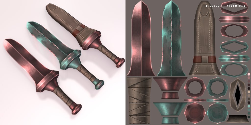 2025.11.23-銅武器2・ナイフ。青錆の変色を少しだけ塗りを変えてみる。テカリはいっそ無くしても良い気がするけど統一感無くなるので、一通り作るまでは同じ感じで作る。 #3D #blender pic.x.com/NcVfdFOqzo