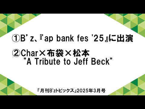 ①B’z、『ap bank fes '25』に出演 ミスチル桜井と再共演②Char×布袋×松本"A Tribute to Jeff Beck"【『月刊B'zトピックス』2025年3月号】 ぜひご覧ください。 ★次回(3/16月 予定) 内容決まり次第お知らせ致します #Bz youtu.be/cUOQ55veeMM