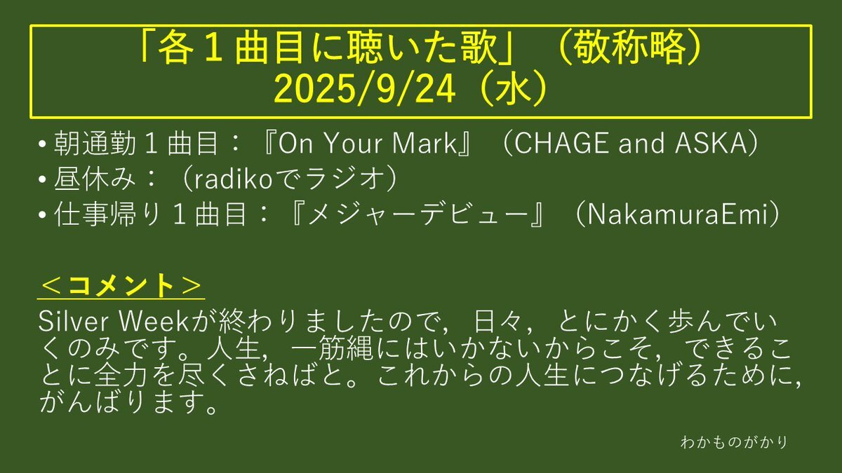 《2025/9/24(水)の「各1曲目に聴いた歌」(敬称略)》 朝通勤1曲目:『On Your Mark』(CHAGE and ASKA) 昼休み:(radikoでラジオ) 仕事帰り1曲目:『メジャーデビュー』(NakamuraEmi) # #ラジオ #CHAGE_and_ASKA #NakamuraEmi #ふらみち #radiko pic.x.com/QAjfWLIt6C