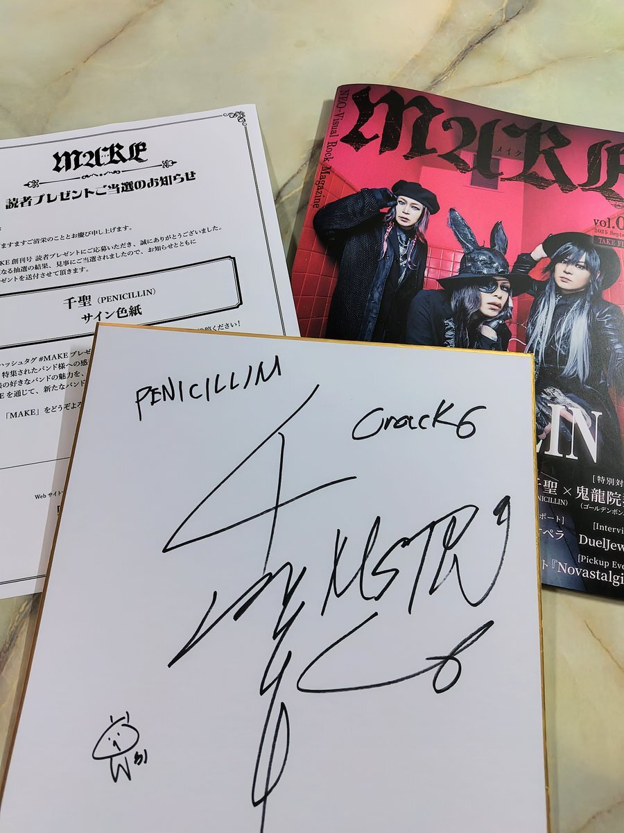 今回のMAKEは「千聖さん特集号」だと勝手に思っているので、千聖さん/MSTRのサイン色紙に応募して見事当選いたしました🤭💕 大好きな獅子丸さんがロケ地で嬉しいキリショーさんとの対談🥰(クレモン楽しかった👻 )今は阿修羅CD&DVDを絶賛満喫中です✨ #MAKEプレゼント #PENICILLIN #Crack6 pic.x.com/LmaSYP8CSF