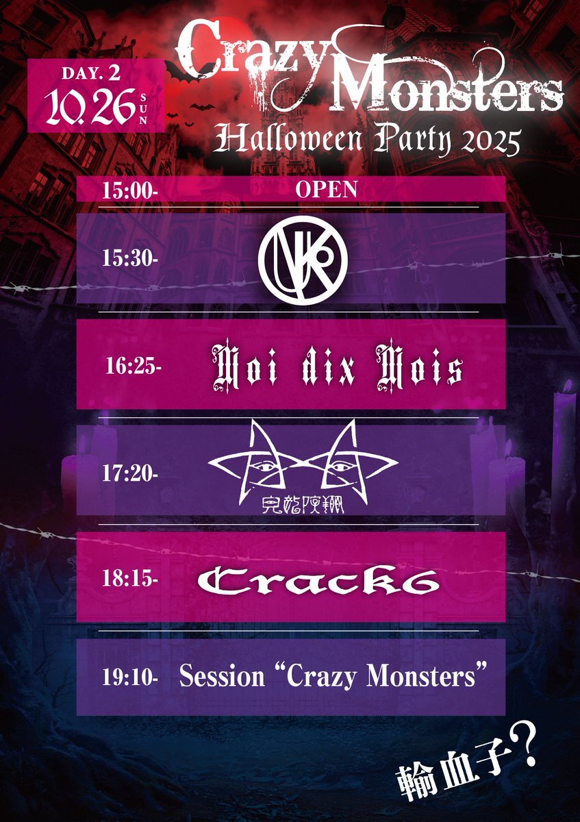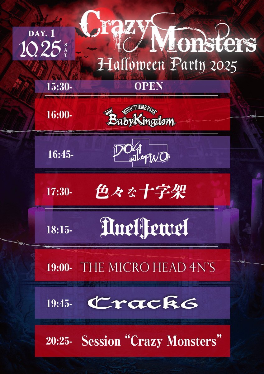 【拡散】 “Crazy Monsters”#クレモン   ⚠️タイムテーブル解禁⚠️ 🎃Crazy Monsters 🎃 🦇Halloween Party 2025🦇 10月25日(土) DAY.1 10月26日(日) DAY.2 🎫チケット絶賛発売中! ↓↓ eplus.jp/crazymonsters/ ↓↓ l-tike.com/cm/ x.com/crazy__monster…