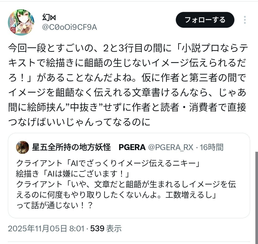 追記です 本人は正当な権利の行使を騙っていますが、であればわざわざ「デカいAIポスター飾ります!」とポストした理由について詰問しなくてはならなくなりますね ご自身の誤謬におそらく気付いていないのでしょうが