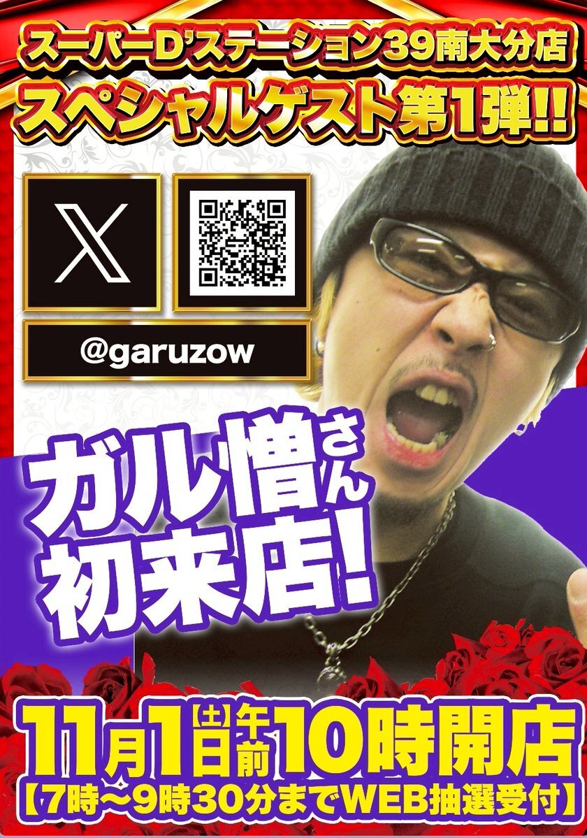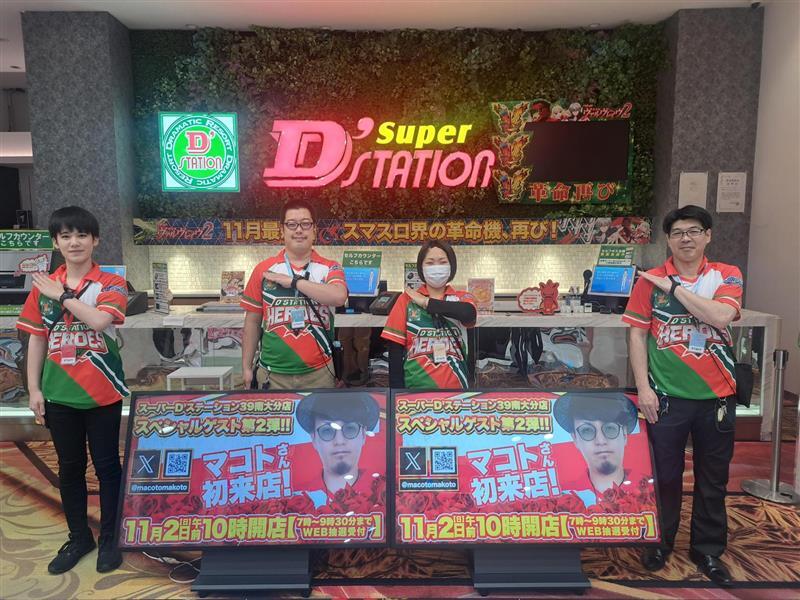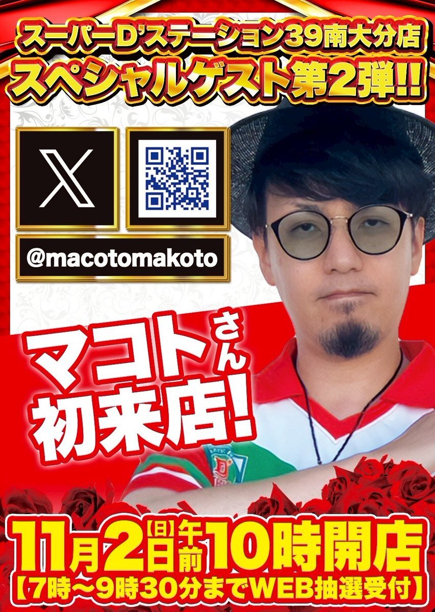 明日11月2日[日曜日]は! 怒涛の3連続豪華ゲスト来店の ど真ん中を飾るっ! D'ステーションヒーローズから 『マコトさん初来店✨️』 今回は南大分店のみの独占✨️ ぜひ朝からご来店ください! @macotomakoto #777リーグ #マコト #Dステ南大分 #DMM #ぱちタウン pic.x.com/DMIcok7i2K
