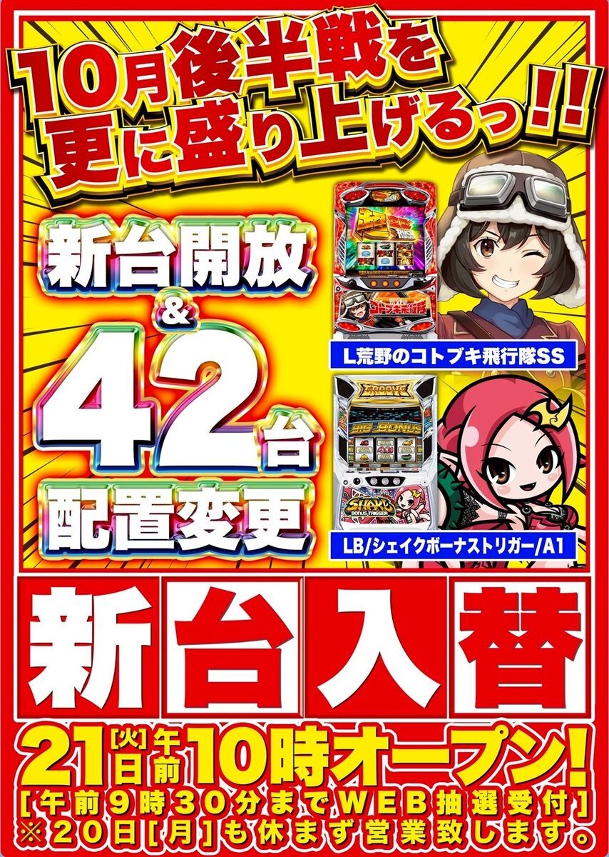 21日[火曜日]は! スーパーD'ステーション 39南大分店の『新台入替』👍 ・荒野のコトブキ飛行隊 p-town.dmm.com/machines/4891/ ・シェイク p-town.dmm.com/machines/4893/ の2機種開放と共に、42台の 配置変更! さあ、10月後半戦のスタートです😎 #パチンコ #スロット #新台入替 #Dステ南大分 pic.x.com/PrNd139V6O