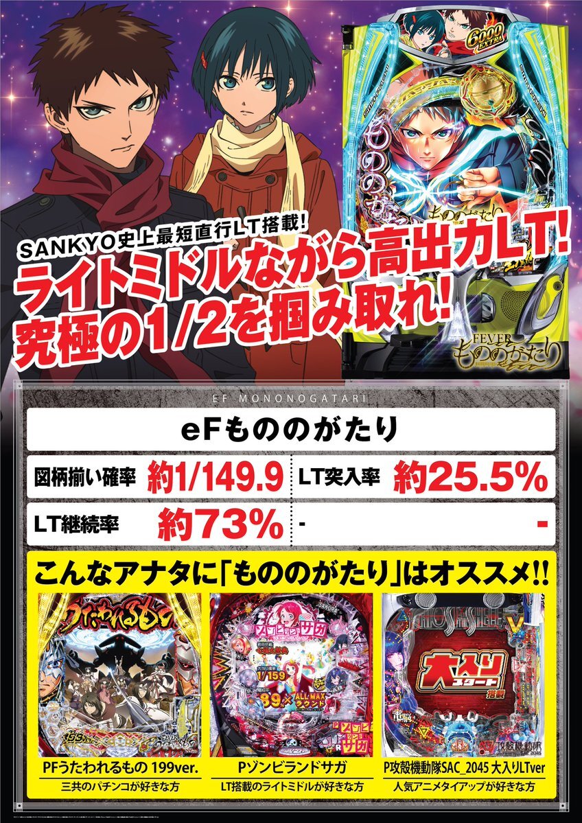 最近恒例の新機種紹介シリーズ! 第3弾の本日は、 11月6日[木曜日]導入の ・eFもののがたり p-town.dmm.com/machines/4876/ 注目はやはりスペック! 三共史上過去イチのLT突入率!? 大量導入です😎 #パチンコ #最新台 #ラッキートリガー #Dステ南大分 #もののがたり #三共 pic.x.com/CAtIpjGben