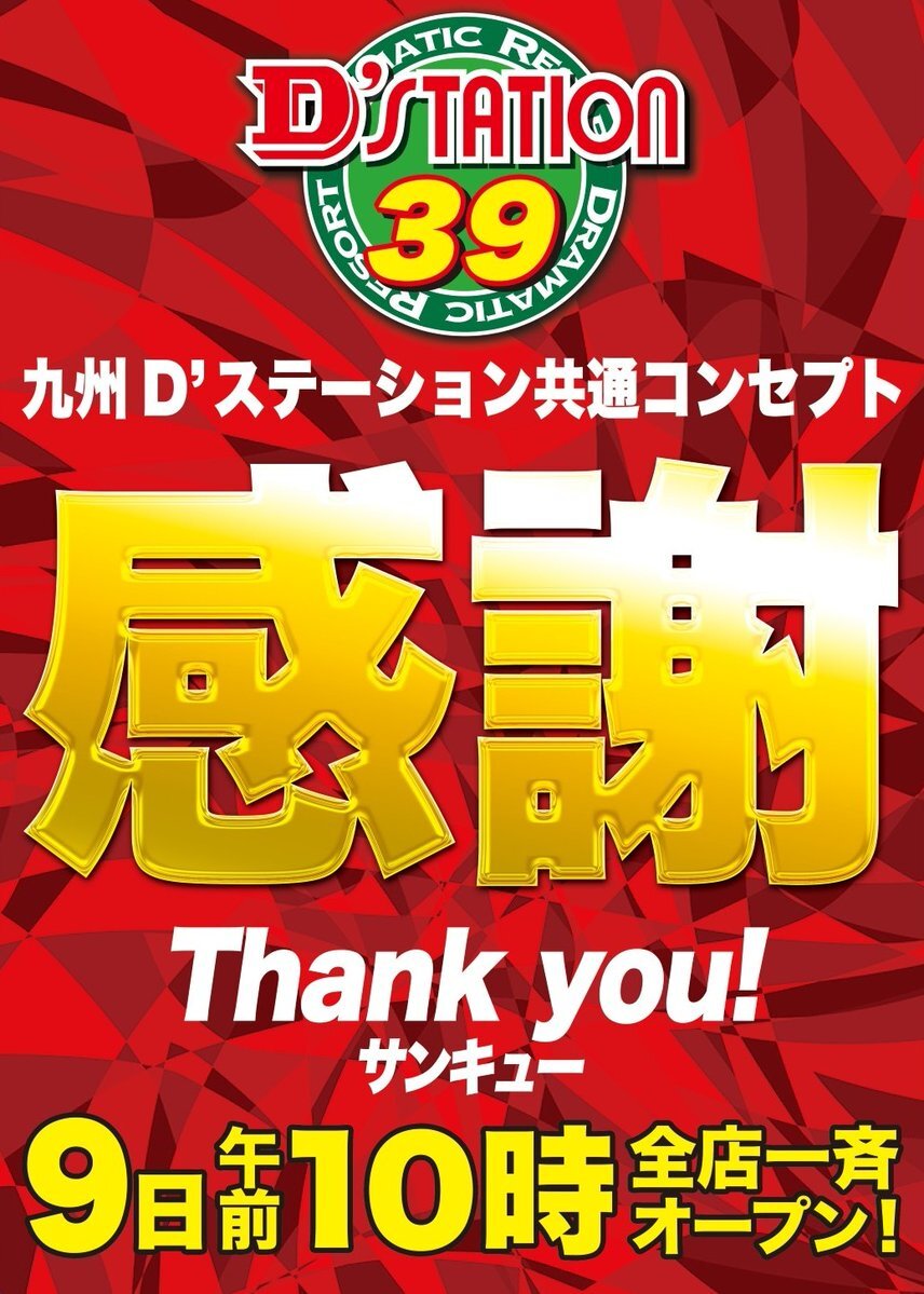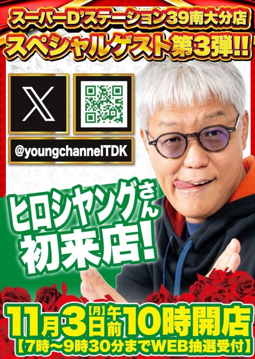 ちょい早目のご案内✨️ 明日3日[月・祝]は! 『感☆謝〜Thank you〜』      × 『ヒロシヤングさん初来店』 怒涛の3日間連続豪華ゲスト来店の “トリ”を飾って貰います! 早朝1番、抽選からの ご来店をお待ちしております😊 @youngchannelTDK #Dステ南大分 #大分 #ヒロシヤング #感謝 pic.x.com/1Qq625GmbK