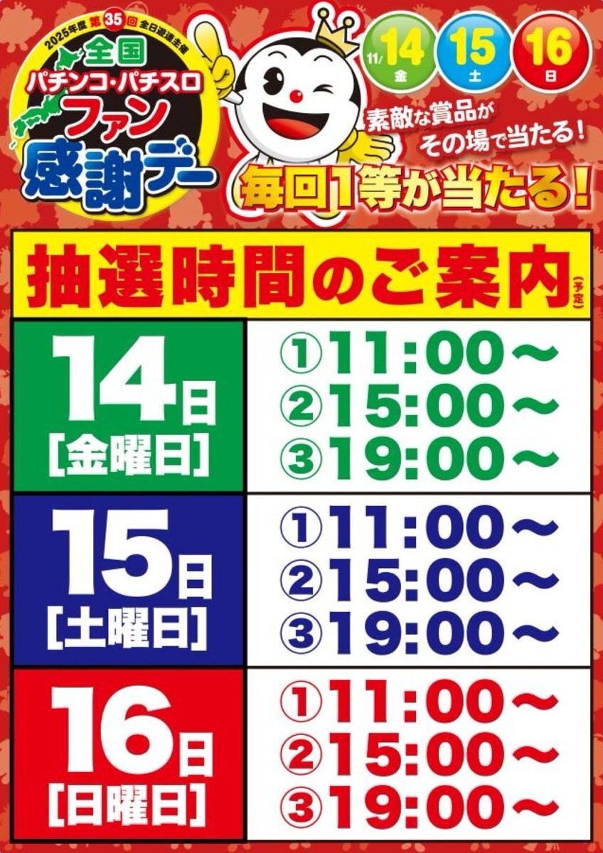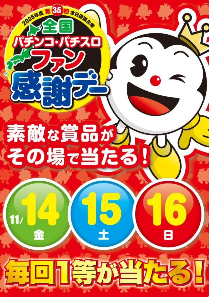 14日・15日・16日の3日間! 『パチンコ・パチスロ  ファン感謝デー』 ↓南大分店の注目ポイント ・1日3回、計9回のチャンス ・毎回1等が必ず当たる! ・合計当選本数292本! ・ハズレ券はティッシュと交 ご遊技しながら豪華賞品 GETの大チャンスです👍 #ファン感謝デー #抽選 #当選 #Dステ南大分 pic.x.com/nWjEeeIzwA