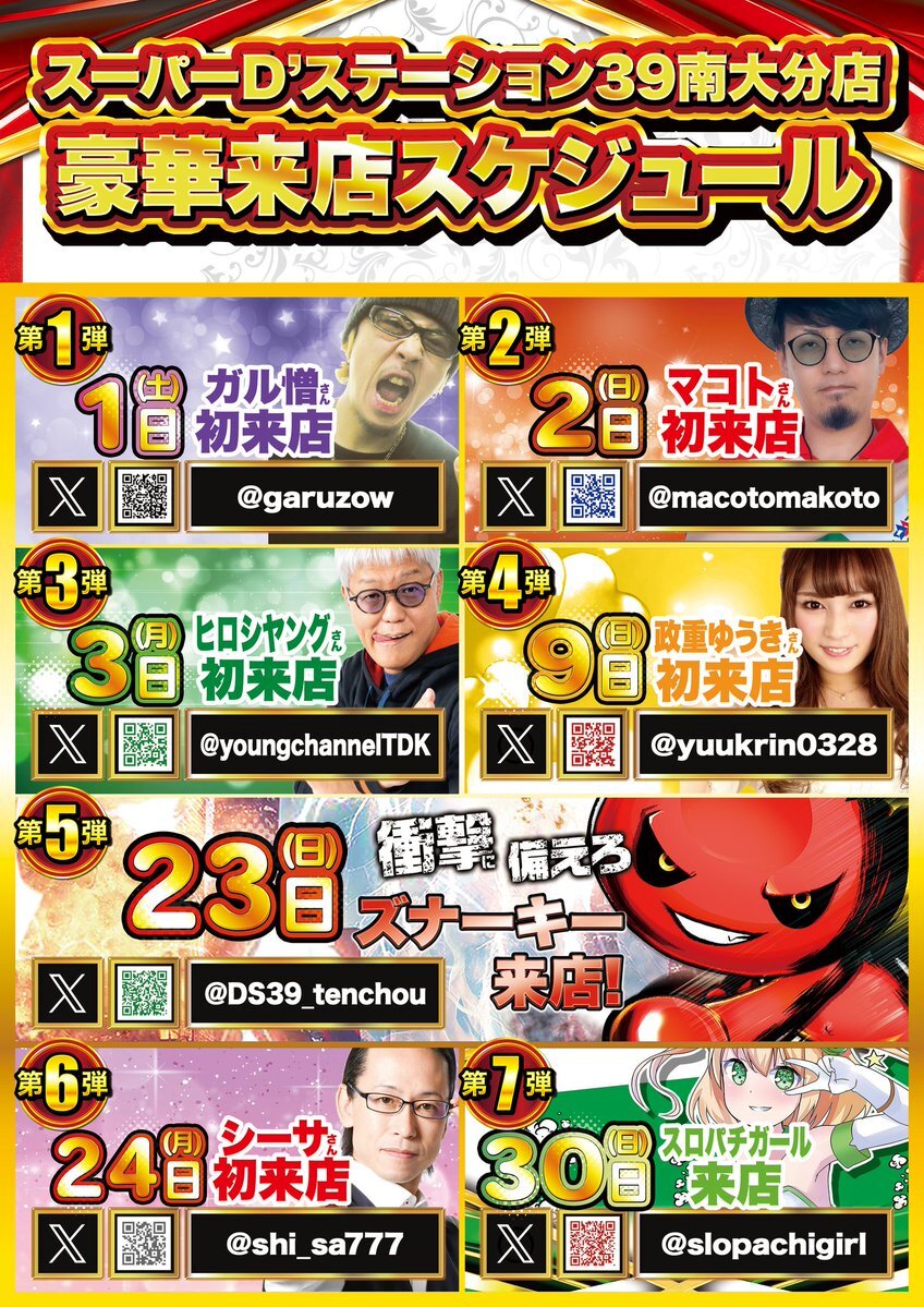 明日29日[水曜日]は! 『感☆謝〜Thank you〜』 10月ラストです👍 一部の方からの希望もあり、 11月の来店スケジュールの ご案内です。ぜひご来店を✨️ #777リーグ #dステ #感謝 #29日 #11月 #Dステ南大分 #来店 pic.x.com/spg76FQut7