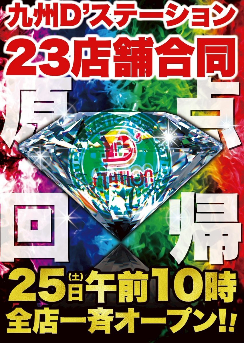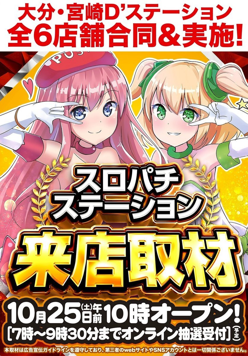 明日25日[土曜日]は! 毎月最終土曜日恒例! 『九州D'ステーション  23店舗合同一斉オープン!』       × 『大分・宮崎D'ステーション  全6店舗合同実施!  スロパチステーション来店取材』 異色のコラボ実現😍🥳😎👍 朝からのお越しを 強くオススメ致します。 #スロパチ #Dステ南大分 pic.x.com/Zwa07xbYpy