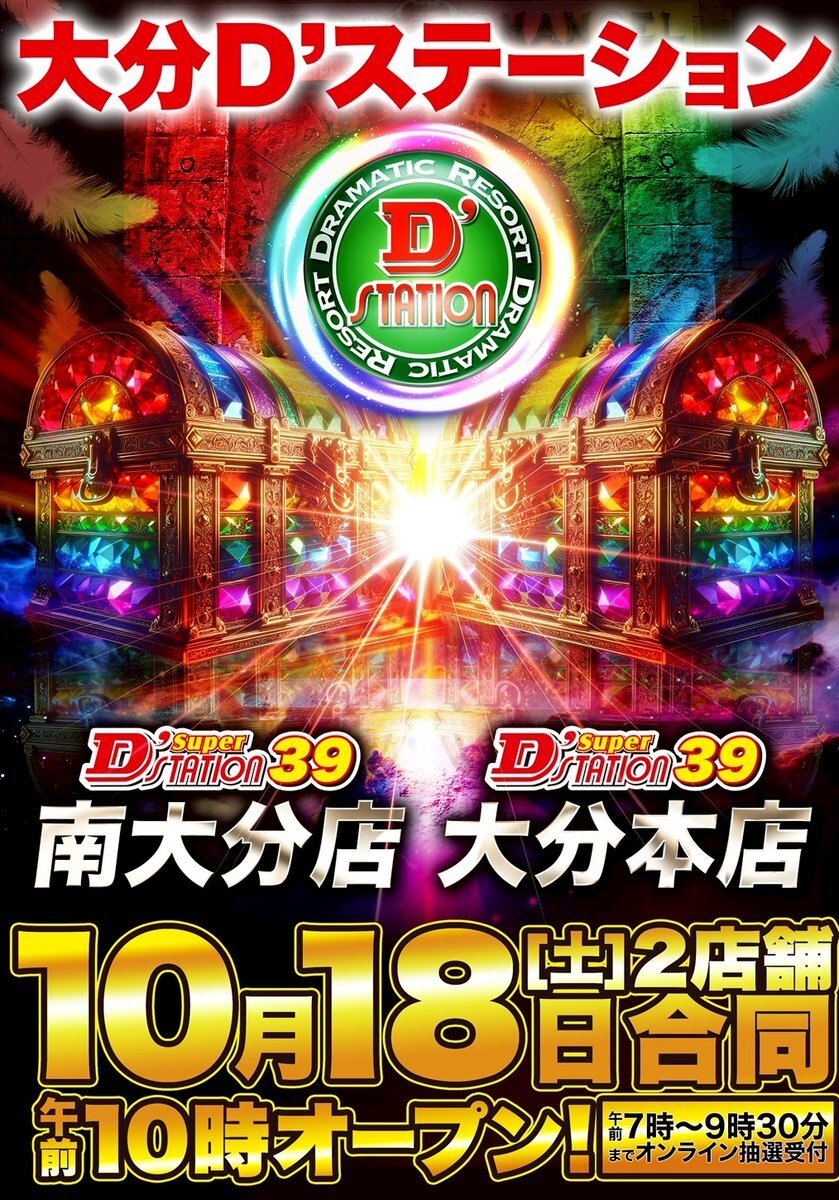 明日18日[土曜日]は! 月イチ恒例✨️ 『大分D'ステーション       2店舗合同』 2,000台規模で挑む週末👍 ↓過去の傾向や当日の模様は  随時、コチラからチェック p-town.dmm.com/free_pages/214… #スロット #パチンコ #DMM #スロセレ #Dステ南大分 #合同 pic.x.com/SgZ1gxHXqi