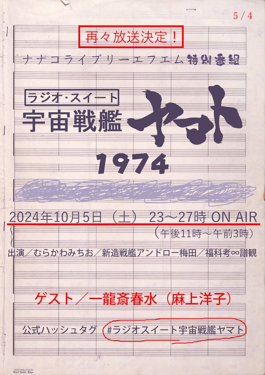 【拡散波動砲(リツイート)希望】 ナナコライブリーエフエム特別番組『ラジオ・スイート 宇宙戦艦ヤマト1974』再々放送決定! 2024年10月5日(土)23時~ ON AIR!! 775fm.co.jp/2024/09/27/%e3… #宇宙戦艦ヤマト #一龍斎春水 #麻上洋子 #775ライブリーFM #ラジオスイート宇宙戦艦ヤマト