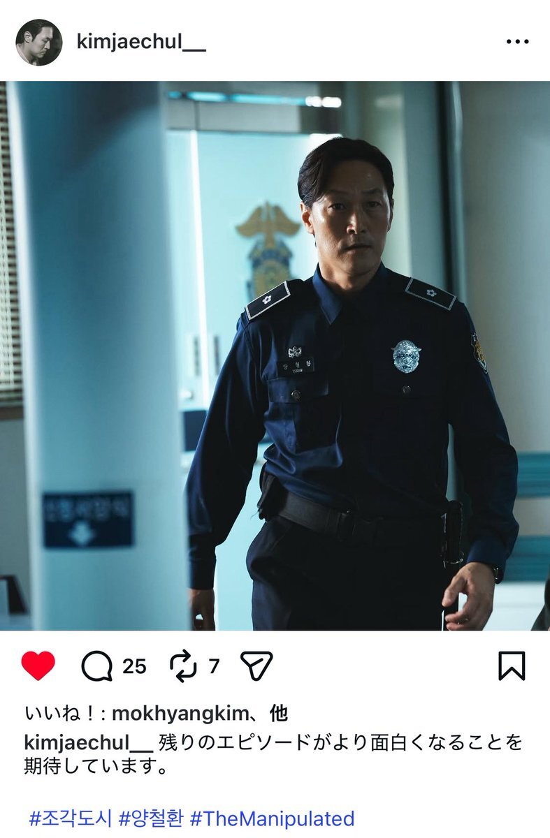刑務官で脱獄したテジュン(チ・チャンウク)を追う“中立的な追跡者”ヤン・チョルファン役のキム・ジェチョルさんのInstagram ✒️ 残りのエピソードがより面白くなることを期待しています。 劇中で数少ないまともな人😅 この方が出てくるとホッとする! #dohkyungsoo #捏造された都市 pic.x.com/tRtifZNSXi