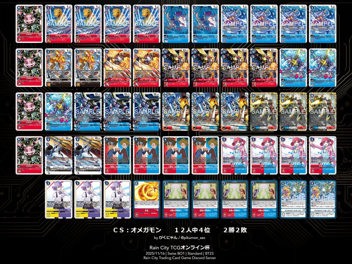 Rain Cityオンライン杯 2025年11月16日 スイスBT23 フーディエ 〇 オメガ ✕ ヴァンデ 〇 オメガ ✕ 2勝2敗 12人中4位 #デジモン #デジモンカードゲーム #デジカ #Digimon #マサカのデジカ #DigimonTCG #デジモンカード #DigimonCardGame pic.x.com/oZ4cdSh6yZ