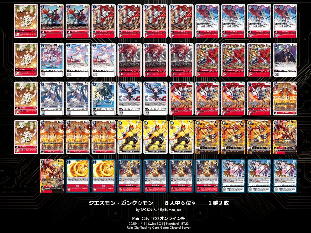 Rain Cityオンライン杯 2025年11月15日 スイスBT23 ロイヤルナイツ ✕ ヴァンデ ✕ ジャスティ 〇 1勝2敗 8人中6位 2人同位 #デジモン #デジモンカードゲーム #デジカ #Digimon #マサカのデジカ #DigimonTCG #デジモンカード #DigimonCardGame pic.x.com/a9hvxFmdO2