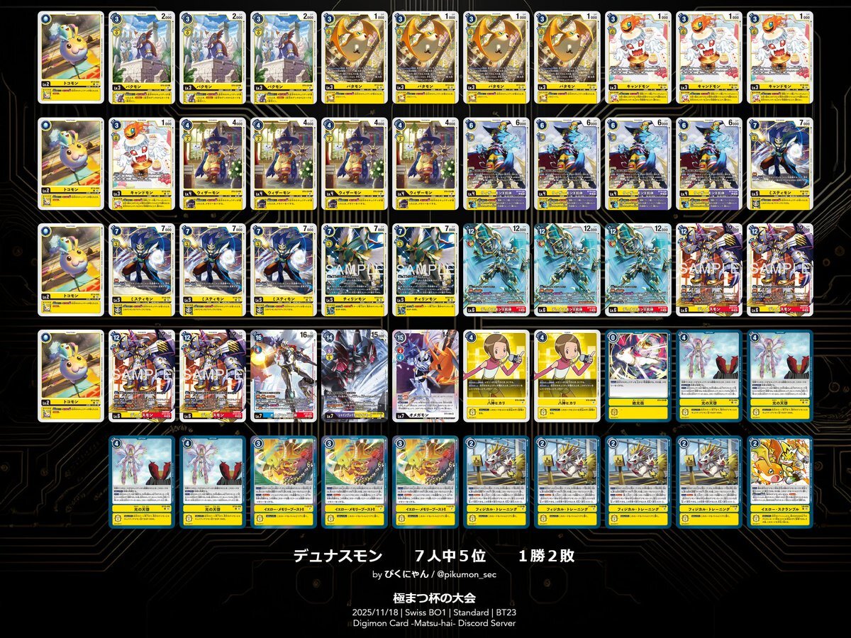 極まつ杯の大会 2025年11月18日 スイスBT23 マスティ 〇 デューク ✕ 忘れ ✕ 1勝2敗 7人中5位 #デジモン #デジモンカードゲーム #デジカ #Digimon #マサカのデジカ #DigimonTCG #デジモンカード #DigimonCardGame pic.x.com/xo3J8fRmln