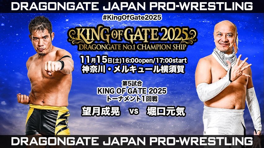 【🎥#KINGofGATE2025 配信情報】 📅11/15 #横須賀 大会 👑KING OF GATE 2025 トーナメント1回戦 #望月成晃 vs #堀口元気 #DragonGateNetwork ではトーナメント全試合を完全配信! dragongate.live/title/?program… #DRAGONGATE #ProWrestling pic.x.com/WFl2DBRw2z