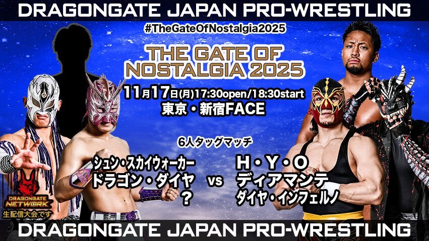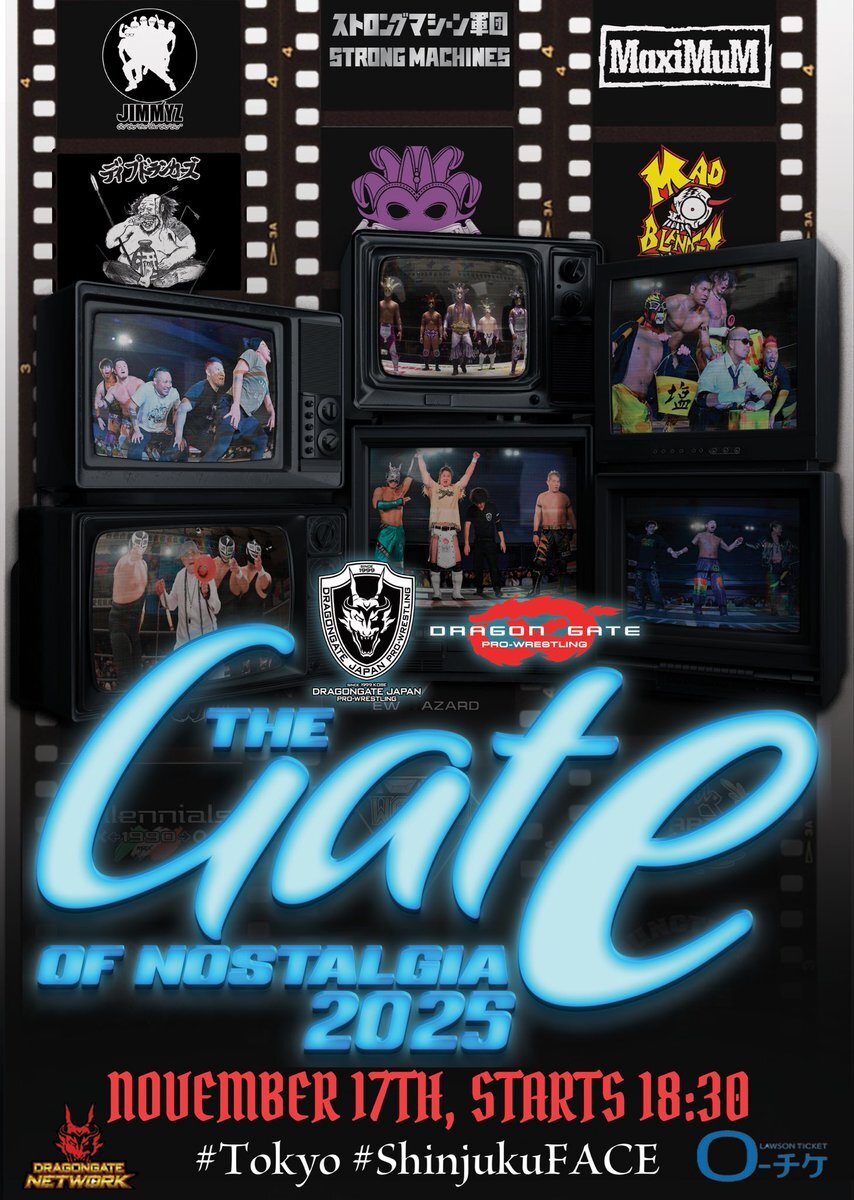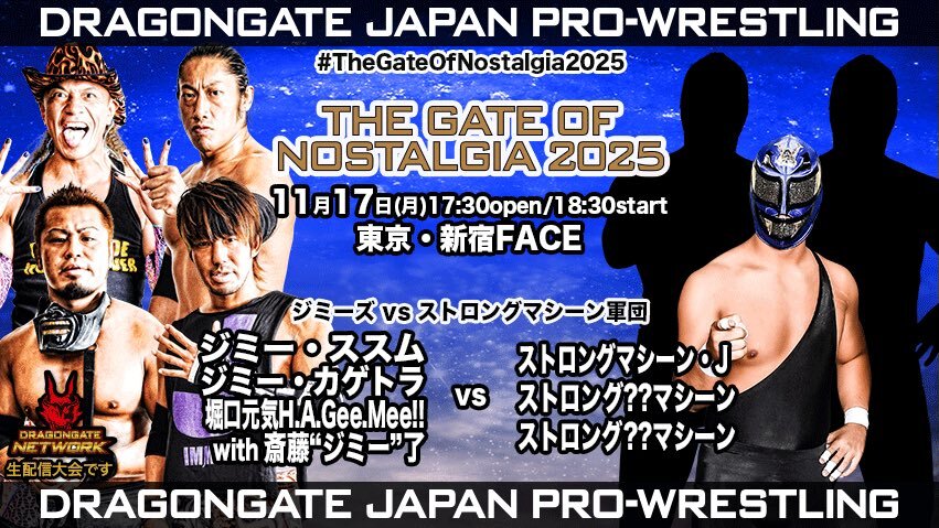 #TheGateOfNostalgia2025 まであと0️⃣1️⃣日!】 あの日あの時が甦る…いよいよ明日! THE GATE OF NOSTALGIA 2025 📅11月17日(月)18:30開始/17:30開場 #新宿FACE ▼大会直前情報 blog.spora.jp/dragongate/arc… 🎫当日券17:00〜発売 #DragonGateNetwork 🎥dragongate.live #DRAGONGATE #njpw pic.x.com/Hsgz5faRga