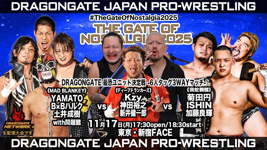 【いよいよ本日開催! #TheGateOfNostalgia2025 】 11月17日(月)18:30試合開始/17:30開場 #東京 #新宿FACE 🎫当日券は 17:00より発売いたします ▼大会直前情報 blog.spora.jp/dragongate/arc… #DragonGateNetwork でも生配信!! 🎥dragongate.live #DRAGONGATE #njpw pic.x.com/rQqh6cJMqs