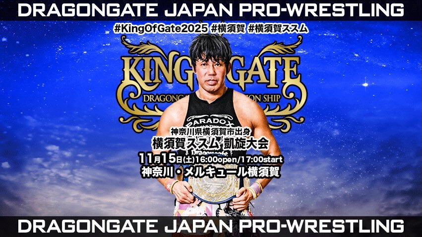 【11/15 #横須賀 大会 直前情報】 #KINGofGATE2025 #横須賀ススム 凱旋大会 11月15日(土)17:00試合開始/16:00開場 #神奈川 #メルキュール横須賀 ▼大会詳細情報 blog.spora.jp/dragongate/arc… 🎫当日券は 14:30より発売開始 🎥#DragonGateNetwork dragongate.live/title/?program… #DRAGONGATE pic.x.com/mMpC2spTPn