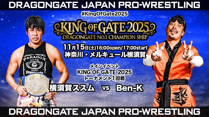 【🎥#KINGofGATE2025 配信情報】 📅11/15 #横須賀 大会 👑KING OF GATE 2025 トーナメント1回戦 #横須賀ススム vs #Ben_K #DragonGateNetwork ではトーナメント全試合を完全配信! dragongate.live/title/?program… #DRAGONGATE #ProWrestling
