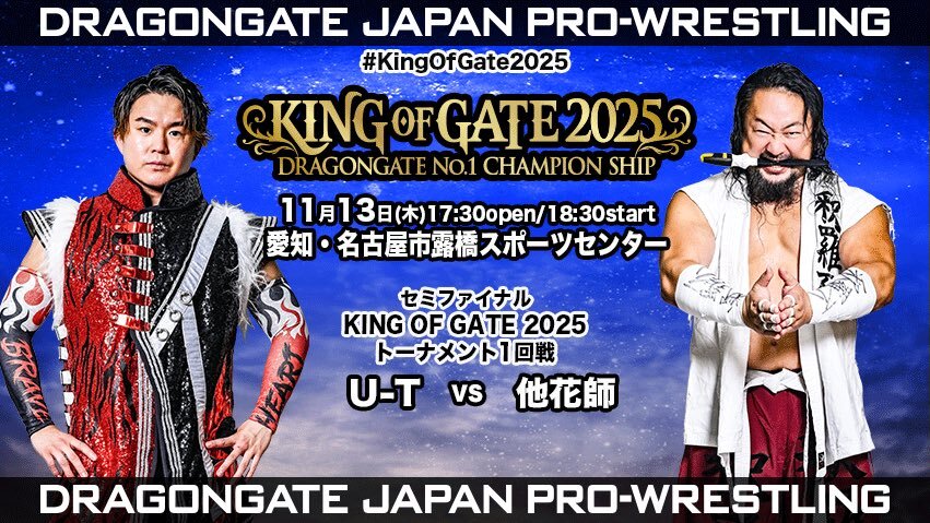 【🎥#KINGofGATE2025 配信情報】 📅11/13 #名古屋 大会 👑KING OF GATE 2025 トーナメント1回戦 #U_T vs #他花師 #DragonGateNetwork ではトーナメント全試合を完全配信! dragongate.live/title/?program… #DRAGONGATE #ProWrestling