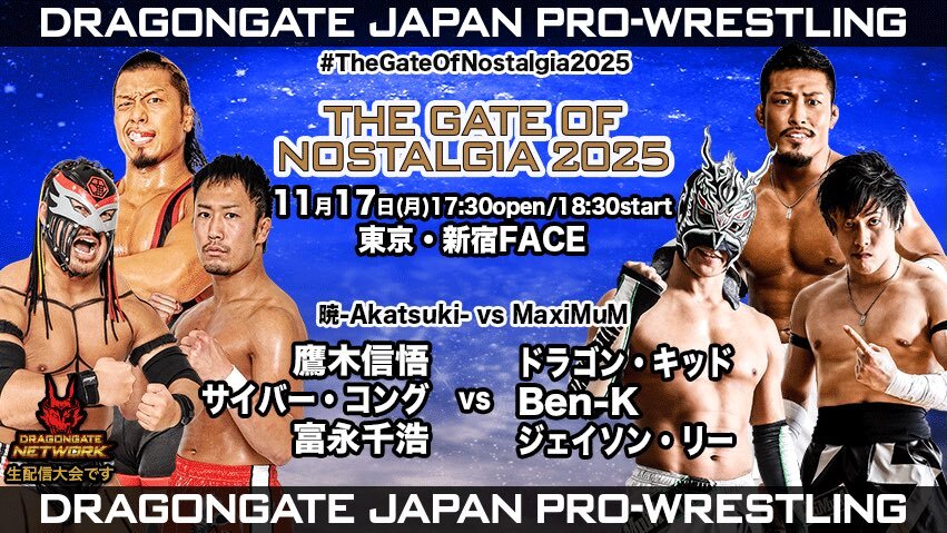 #TheGateOfNostalgia2025 まであと0️⃣1️⃣日!】 11月17日(月)18:30開始/17:30開場 #東京 #新宿FACE #鷹木信悟 が暁復活のため里帰り参戦! #MaxiMuM vs 暁-akatsuki- ▼直前情報 blog.spora.jp/dragongate/arc… 🎫当日券17:00〜発売 #DragonGateNetwork 🎥dragongate.live #DRAGONGATE #njpw pic.x.com/MBE6s6VQqt
