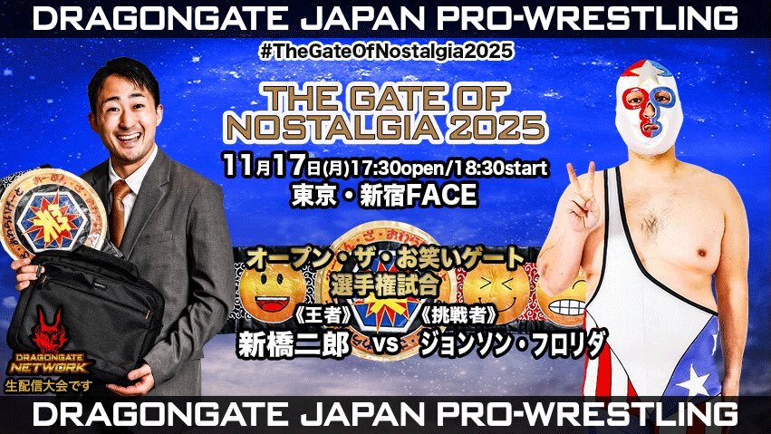 #TheGateOfNostalgia2025 まであと 0️⃣1️⃣日!】 📅11月17日(月)18:30開始/17:30開場 #新宿FACE 初防衛戦にして最強の敵が立ちはだかる! どうなる!?お笑いゲート王座!! ▼大会直前情報 blog.spora.jp/dragongate/arc… 🎫当日券17:00〜発売 #DragonGateNetwork 🎥dragongate.live #DRAGONGATE pic.x.com/RGDDSUqoaN