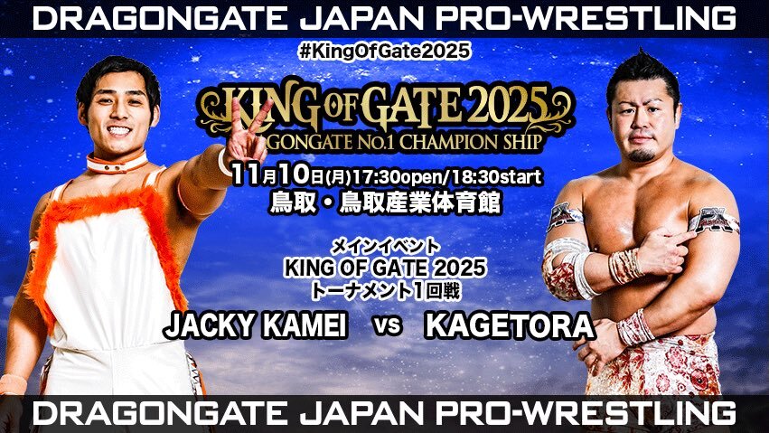 【🎥#KINGofGATE2025 配信情報】 📅11/10 #鳥取 大会 👑KING OF GATE 2025 トーナメント1回戦 #JACKYKAMEI vs #KAGETORA #DragonGateNetwork ではトーナメント全試合を完全配信! dragongate.live #DRAGONGATE #ProWrestling pic.x.com/7LZBiAsRT3 x.com/dragongate_pro…