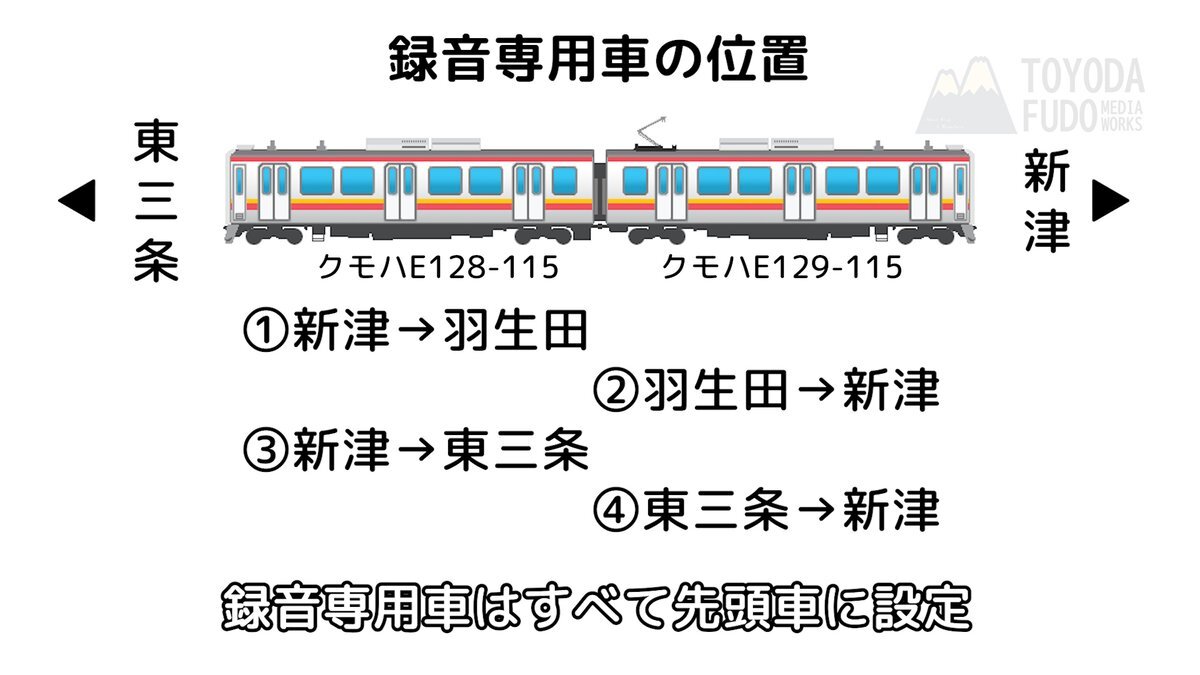 新津をスタート・ゴール地点として、1往復目は新津~羽生田、2往復目は新津~東三条。それぞれ各駅停車パターンと全駅通過パターンとしたほか、東三条折り返し時には各種機器の動作音や珍しい自動放送音声の収録の機会をいただきました。 #E129系 #音鉄 pic.x.com/VimbDkJmSl