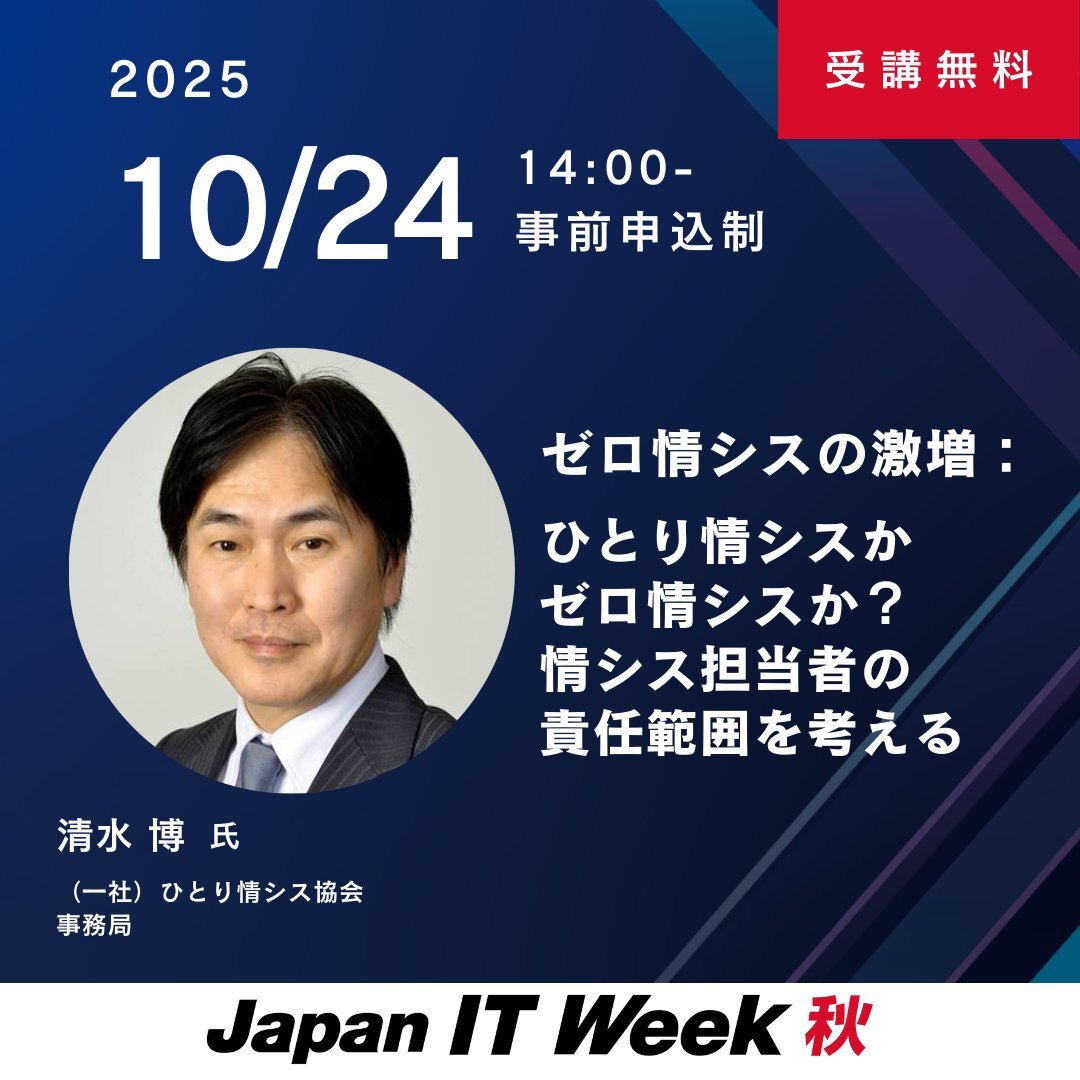 #JapanITWeek 幕張メッセで講演します。今年は「2025年の崖」で中堅中小企業のIT人材が減少、営業職も人材不足で最適な提案をもらうことも減少。大きなパラダイムシフトが始まっています。中堅中小企業の「ひとり情シス」に加えて、拡大する「ゼロ情シス」にもフォーカスした解決策をお話しします。