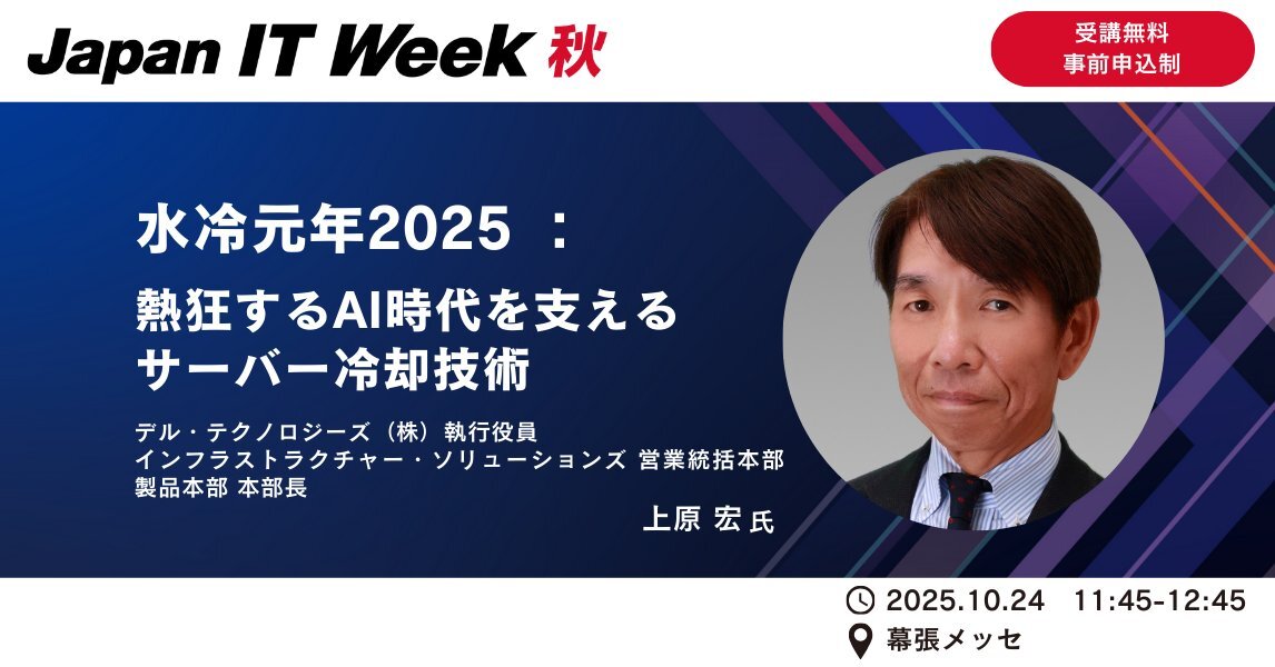 水冷元年2025 : 熱狂するAI時代を支えるサーバー冷却技術💡 📢10月24日(金)11:45~12:45 幕張メッセにて開催される @JapanITWeek にてデル・テクノロジーズ 上原 宏がセミナーに登壇、水冷サーバーの最新動向と新たな「生態系」の必要性、現在起きている実例について解説します。(来場登録要)
