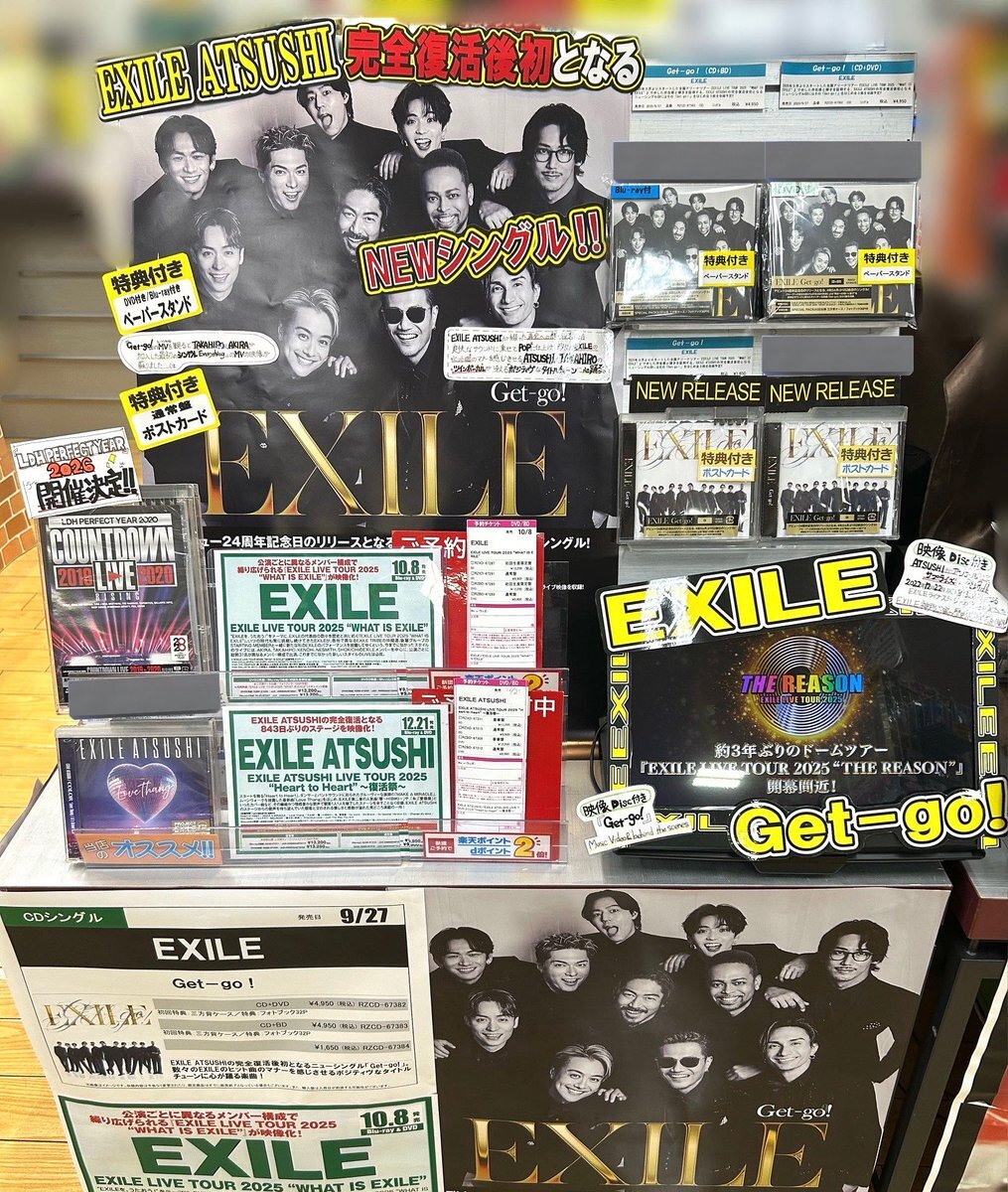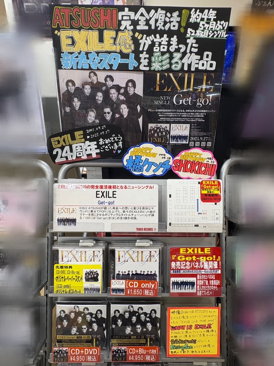 【#EXILE】 🎊EXILE ATSUSHIの完全復活後初となる NEW Single『Get-go!』 絶賛発売中~🔥 パネル展&プレゼント抽選は本日までです!! 🎁特典 ・CD+DVD or Blu-ray …ペーパースタンド ・CD only…ポストカード ご来店お待ちしております🕺🪩 #EXILE_Get_go tower.jp/article/featur… pic.x.com/eoseUsMZOT