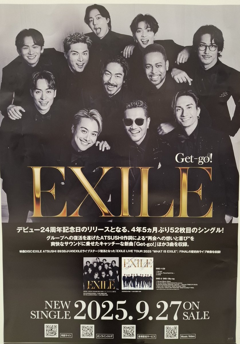 【#EXILE】 デビュー24周年の記念日に放つ52枚目のシングル 『Get-go!』発売中‼️ 🎁特典:初回盤 オリジナル・ペーパースタンド 通常盤 オリジナル・ポストカード #EXILE_Get_go pic.x.com/4ufBhJAiPb