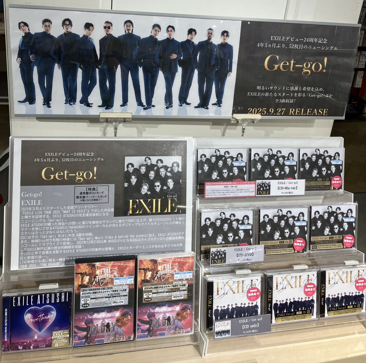 【#EXILE】 デビュー24周年記念日にリリース🎉 『Get-go!』発売中🎵 数々のEXILEのヒット曲のマナーを感じさせるポジティヴなタイトルチューンに心が踊る♪ 🎁先着特典 Blu-ray/DVD付➡️ペーパースタンド CD only➡️ポストカード ご来店お待ちしております! #EXILE24周年 #EXILE_Get_go pic.x.com/byD47obf2u
