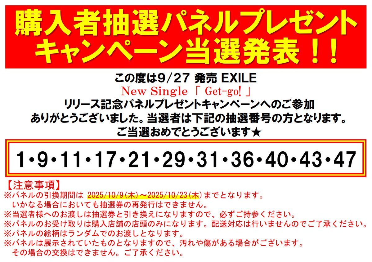 【#EXILE】 \当選番号発表!/ EXILE『Get-go!』 発売記念パネル抽選プレゼント ✨ 当選番号が決定いたしました!🎉 【引換期間】10月8日(水)正午~11月5日(水)閉店まで ご当選された方は、引換券をお持ちの上、引換期間内に店頭までお越しください💁♀️ #EXILE_Get_go pic.x.com/dUXTvT2huf