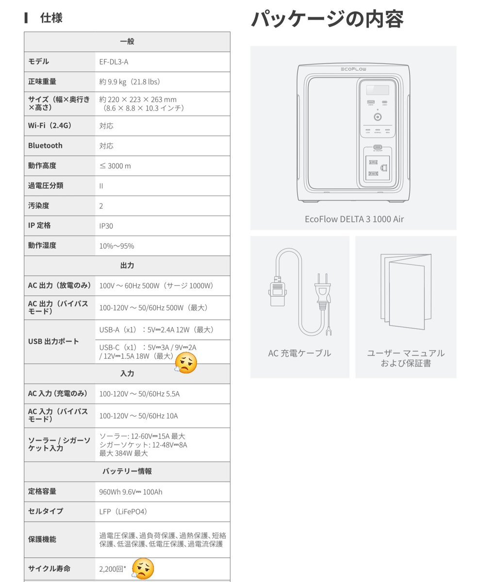 Ecoflow Delta3 1000Air 買おうと思ったんですけど、仕様と値段が中途半端過ぎなのでやめます。 ACが500Wなのは筐体サイズからして仕方ないかなと思ったけど、Type-Cが18Wまでとか草 Type-Cが100W以上対応だったら買ってたかも…ね… #ecoflow pic.x.com/lRfDoFDFcj