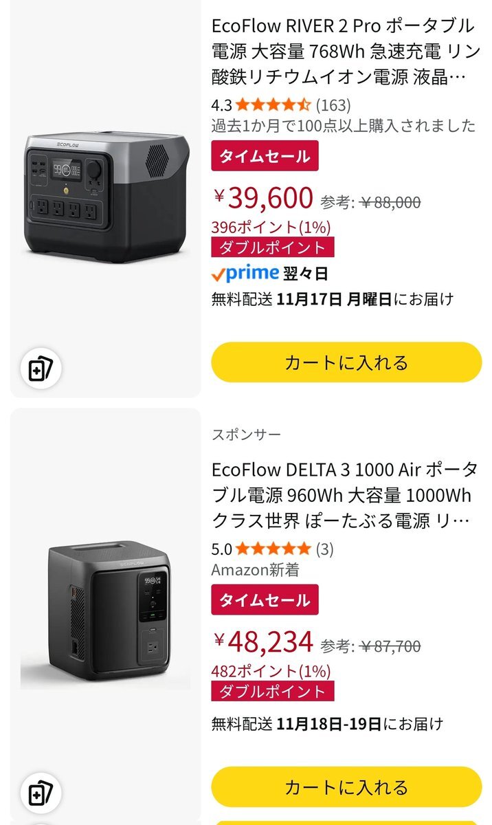 River3より容量大きい物で、家電製品の利用で実用的な物が一つ欲しいが… 正直、どっちが良いのかなぁと迷うね(笑) Delta2 Pro → 定格800W Delta3 1000Air → 定格500W 8634円の差、定格出力は落ちるけど、この手の製品は新しい世代の方が良いかぁ… でも、出力500Wって中途半端だな… #ecoflow pic.x.com/S6SfFjocU6