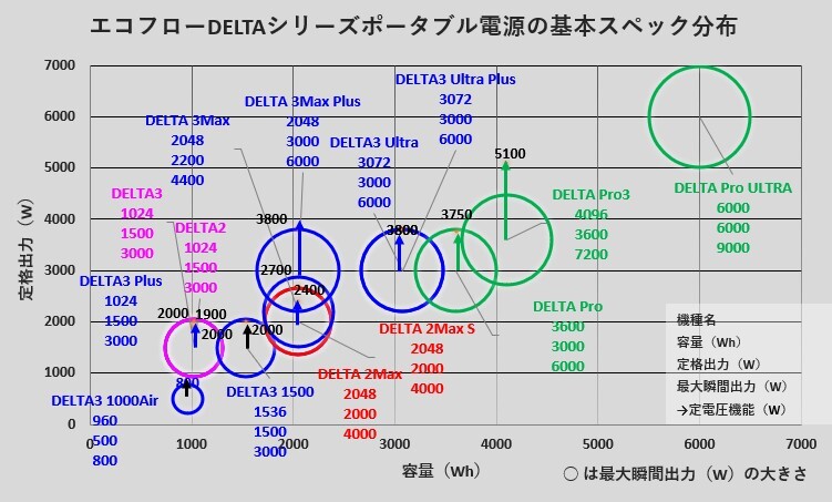 #EcoFlow#DELTA シリーズ の基本性能をマッピングしました パワーと稼働時間のバランスが一目で分かります DELTA Pro:緑 DELTA2:オレンジ DELTA3:青 DELTA2/3同一:ピンク キャンプ、災害対策、車中泊 など、用途に合わせた ポータブル電源 選びの参考にしてください! #エコフロー pic.x.com/lPLx4sHiFE