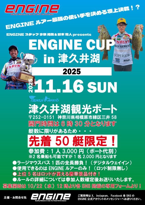 いよいよ今週末に迫ったENGINE CUP in 津久井湖!! お陰様で多くの方にご参加いただき開催することができそうです✨ 受付フォームよりご参加頂きました皆様にはご一報をしておりますのでご確認をお願いいたします❗️ それでは皆様大会当日にお会いするのを楽しみにしております✨ #ENGINE pic.x.com/aLnMfxH8aH