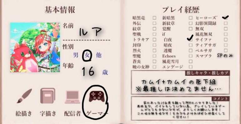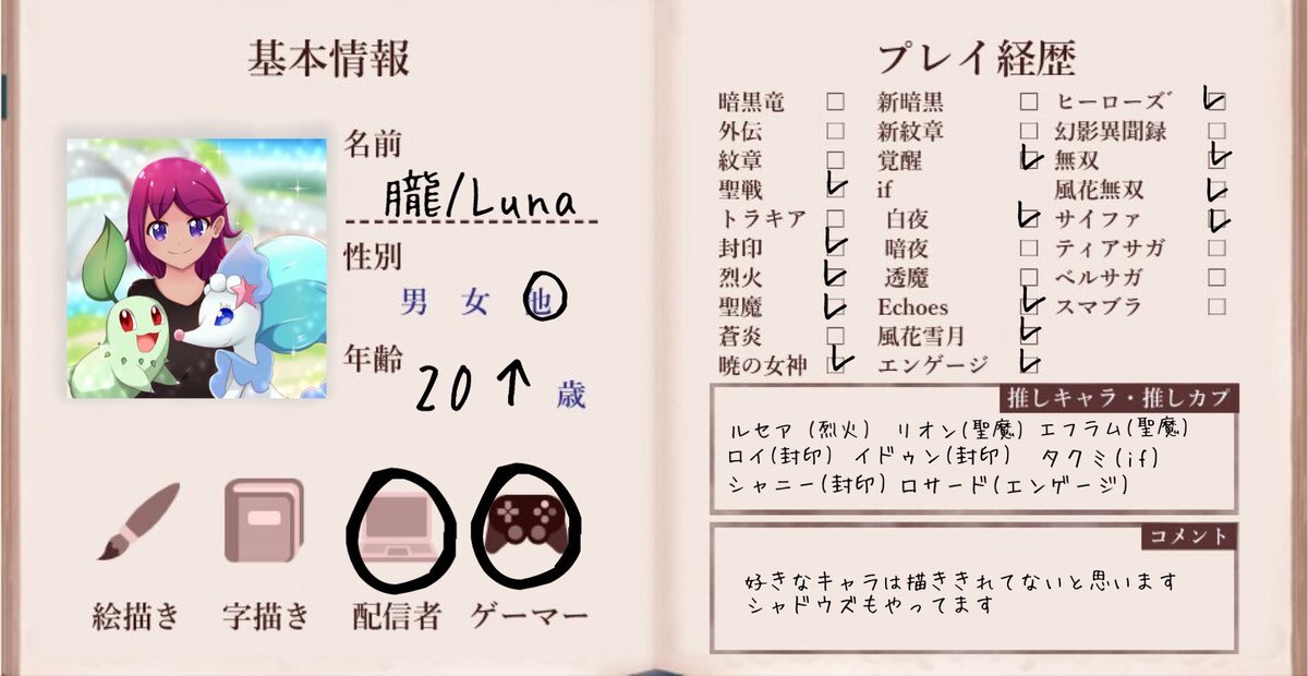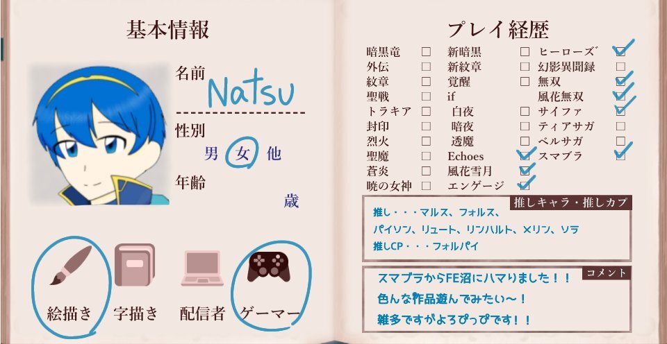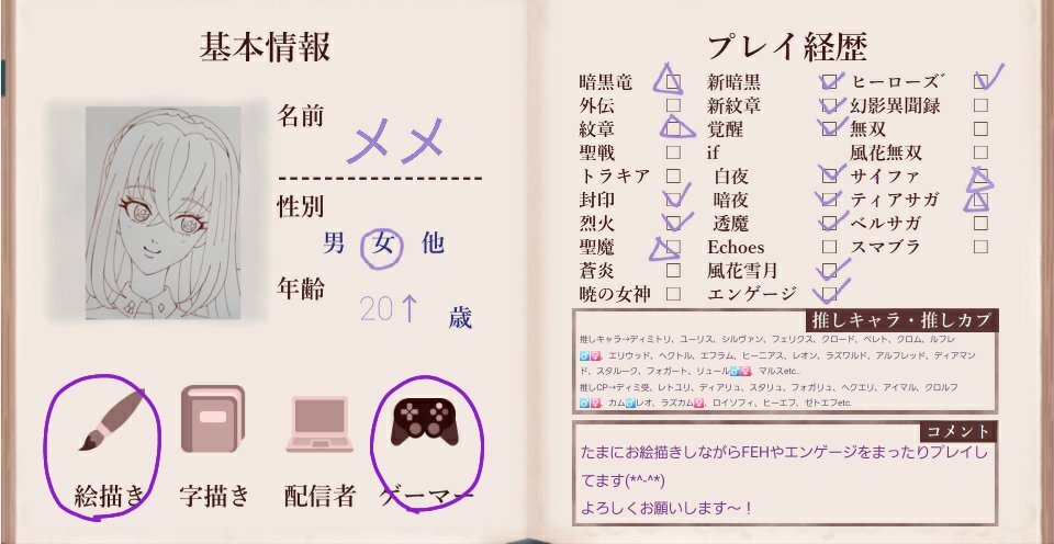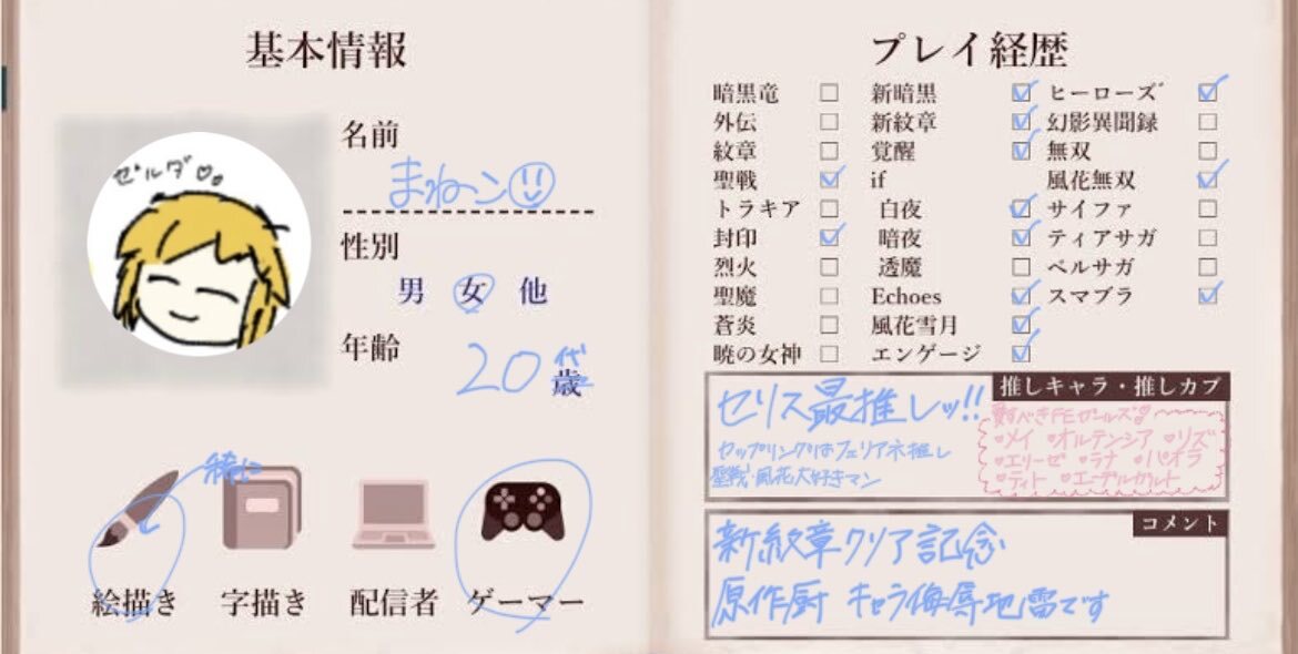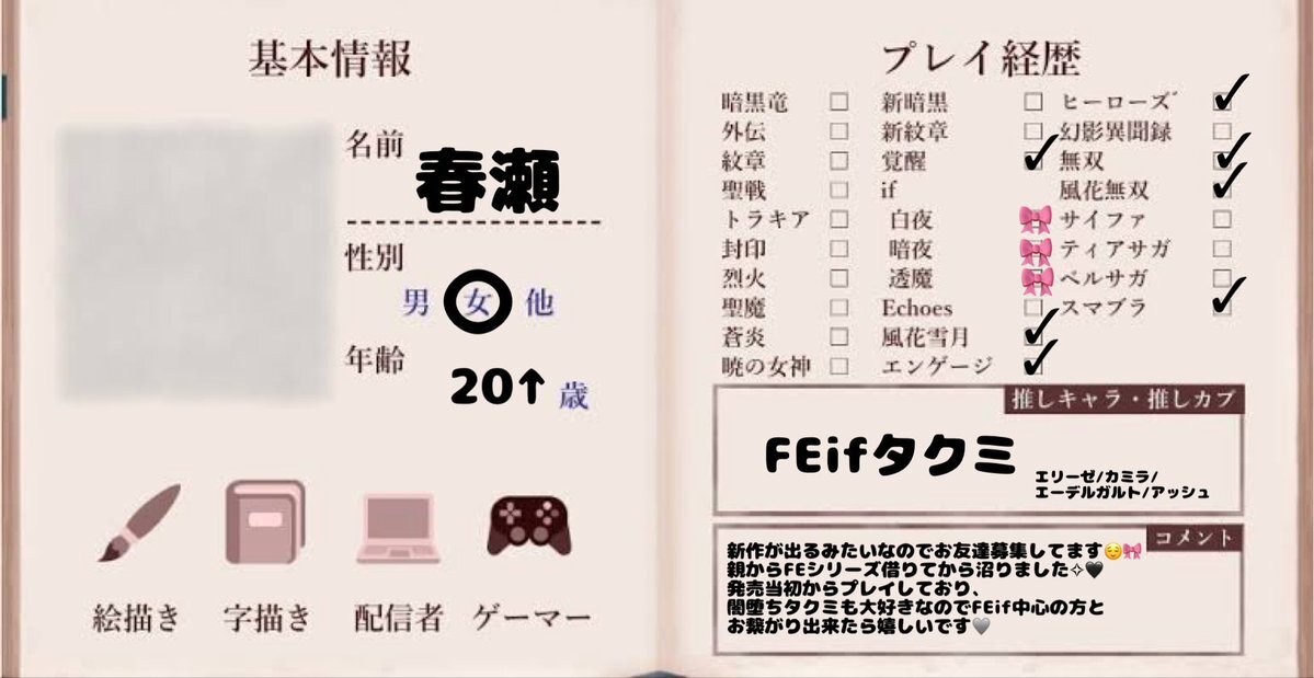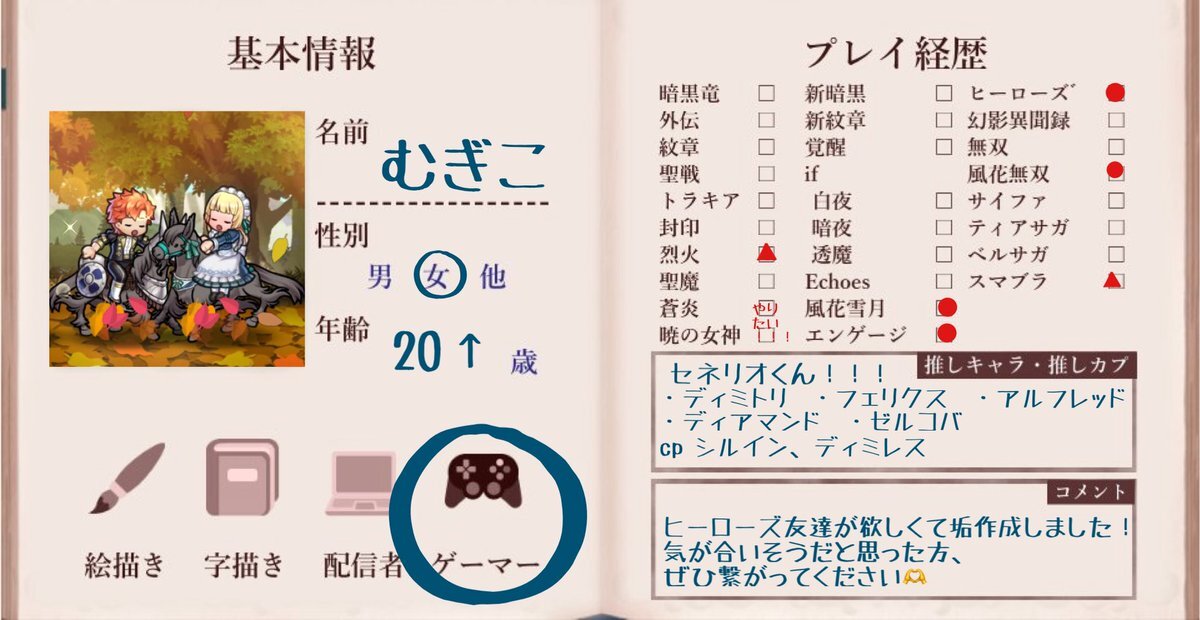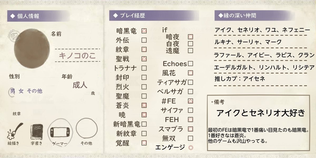 はじめまして! エンゲージを新しく始めて、はまってしまったので新しくFE用を作りました〜 全反応フォローでお迎えいたします❕(片思い3日です) イラストなどお話できるお友達が欲しいです!よろしくお願いします🙇🏻♀️ #FE好きさんと繋がりたい #FE自己紹介カード