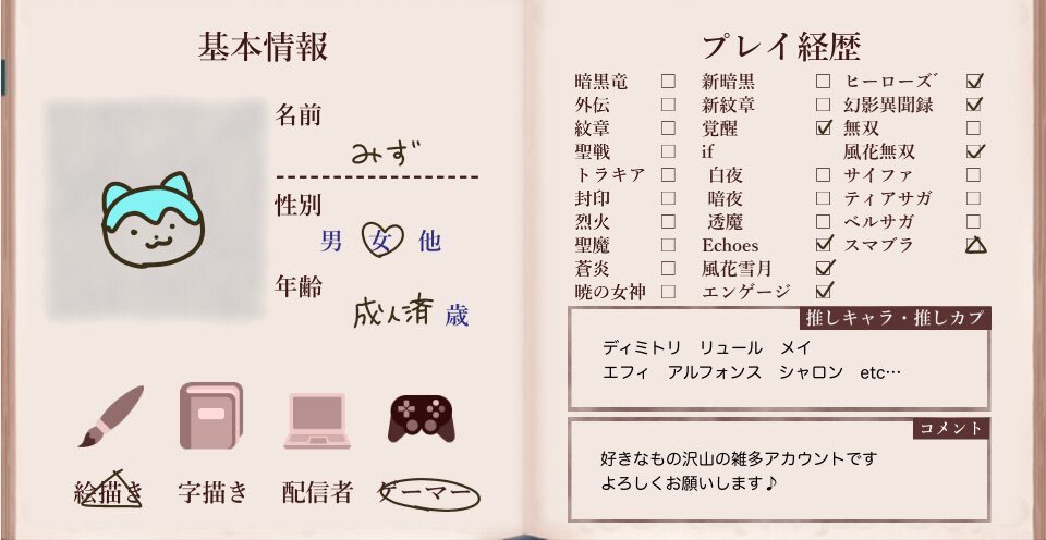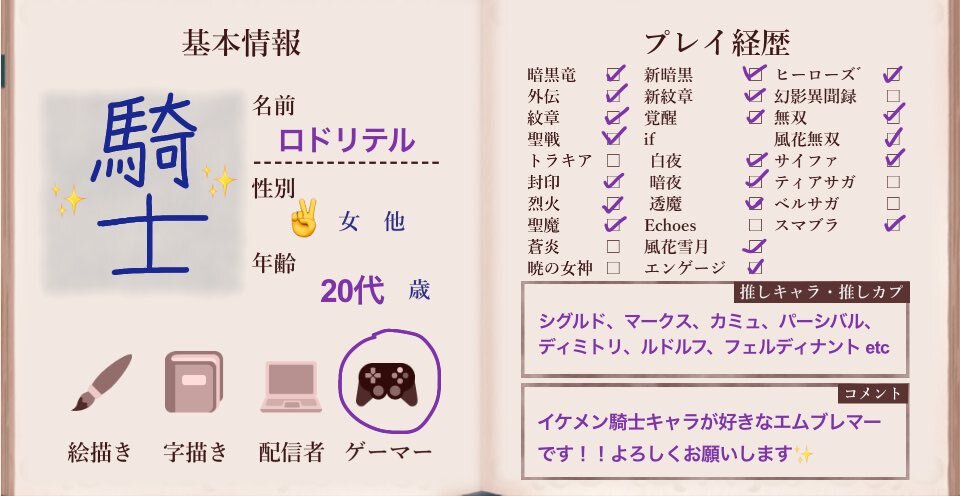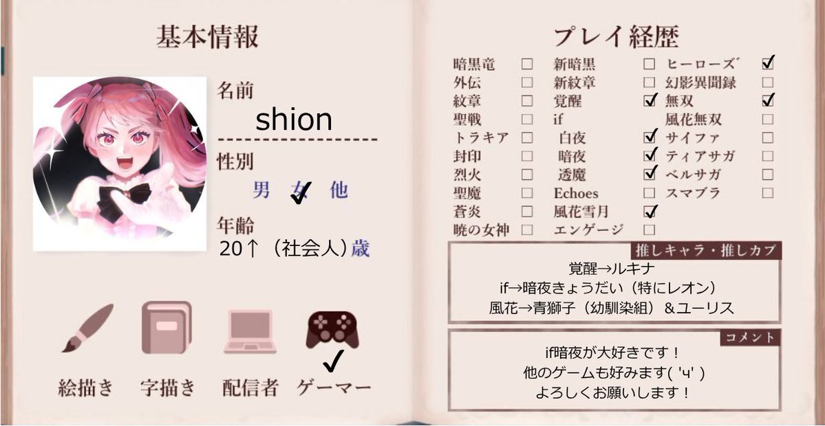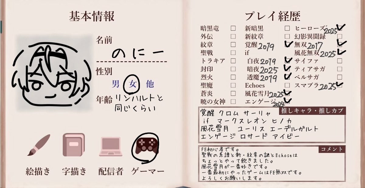 テンプレお借りしました! 覚醒・ifでどっぷりはまりました。暗夜ルナクラはじめ、高難易度での攻略も楽しんでます。 FE含むゲームなど好きなもの雑多垢ですが、よろしくお願いいたします🙇🏻♀️!! #FE自己紹介カード #FE好きさんと繋がりたい pic.x.com/7EmMoF8IOu
