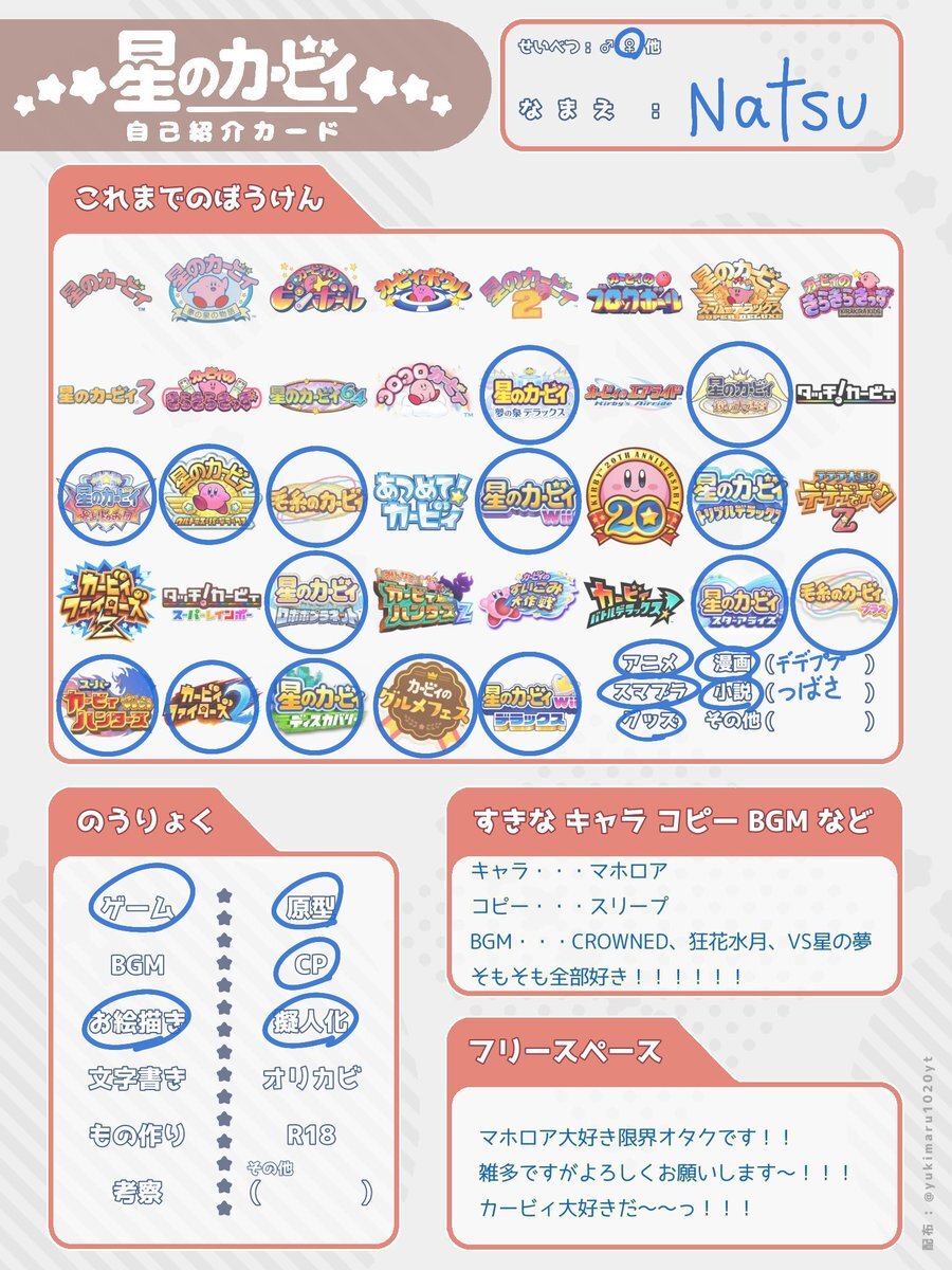 🌟固定ツイ用🌟更新 カービィやFEなどのゲームが大好きです!イラストも描いてます✍️ いいねとリツイートで無言フォロー失礼致します! よろしくお願いします!(⋆ᵕᴗᵕ⋆).+*ペコ #カービィ自己紹介カード #カービィ好きさんと繋がりたい #FE自己紹介カード #FE好きさんと繋がりたい pic.x.com/pelzTds8ps
