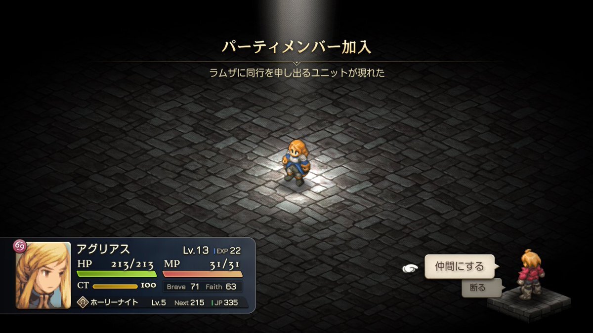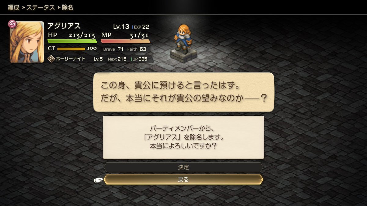 「この身、貴公に預ける!」 加入時の台詞が付いたことで除名時の台詞と連動するようになったのね。細かい。 アグリアスどう育てよかな。火力を伸ばすなら序盤はナイト。Speed伸ばすならシーフ→忍者。女性ユニットなのでMAを活かすためある程度MPをと考えるなら風水士。悩ましいね #FFタクティクス pic.x.com/G3e1rUvcYI