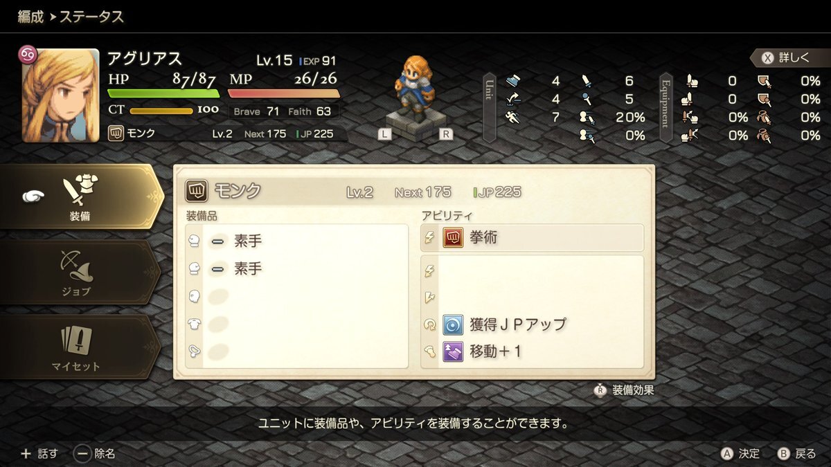 アグリアス序盤ジョブ比較。素のステータス低いから分かりにくいけど、モンク以上に高いHPと回避率ホーリーナイトやっぱり異常だな。これにナイトと同じ重装備出来るから後半はHPオバケに出来る。この個性を活かしたい。最終的には召喚持たせてゴーレム役にしようかなと考えてたり。 #FFタクティクス pic.x.com/F2vPpgveog