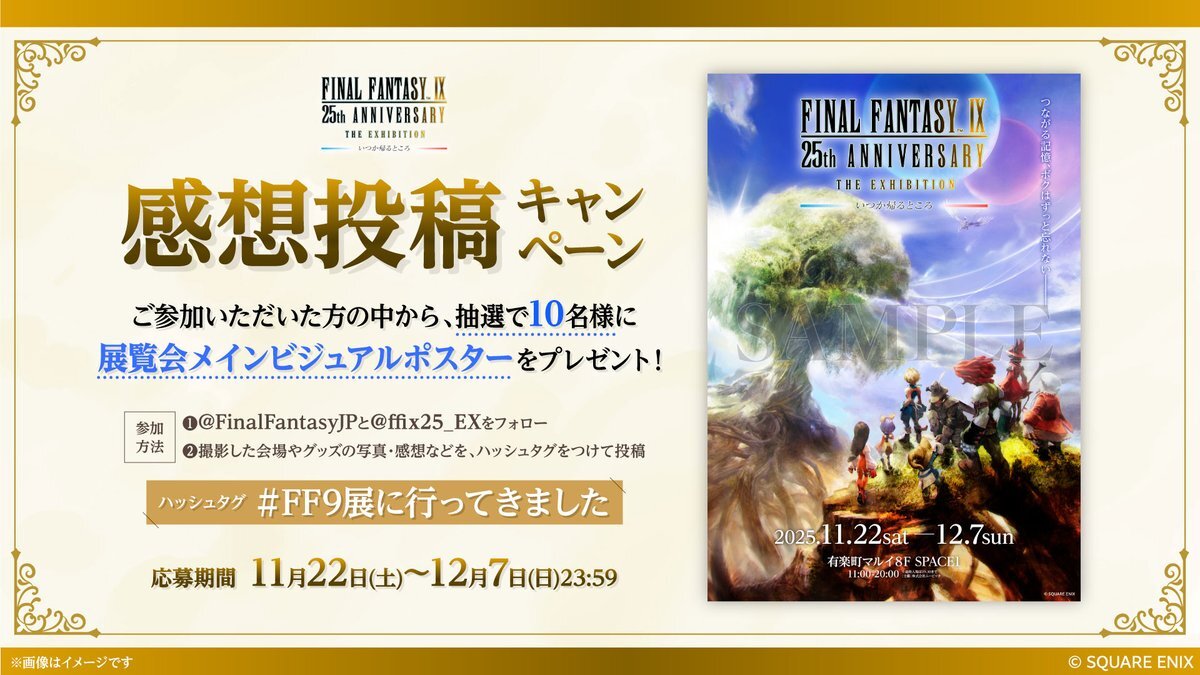\感想投稿キャンペーン開催!/ #FF9展 の感想を投稿してくださった方から抽選で10名様に、 「展覧会メインビジュアルポスター」をプレゼント! ▽応募方法 ①本アカウントと「FF公式X(@FinalFantasyJP)」をフォロー ②「#FF9展に行ってきました」をつけて感想をポスト💬 #FFIX25th #FF9 pic.x.com/X7ZgygCWEH