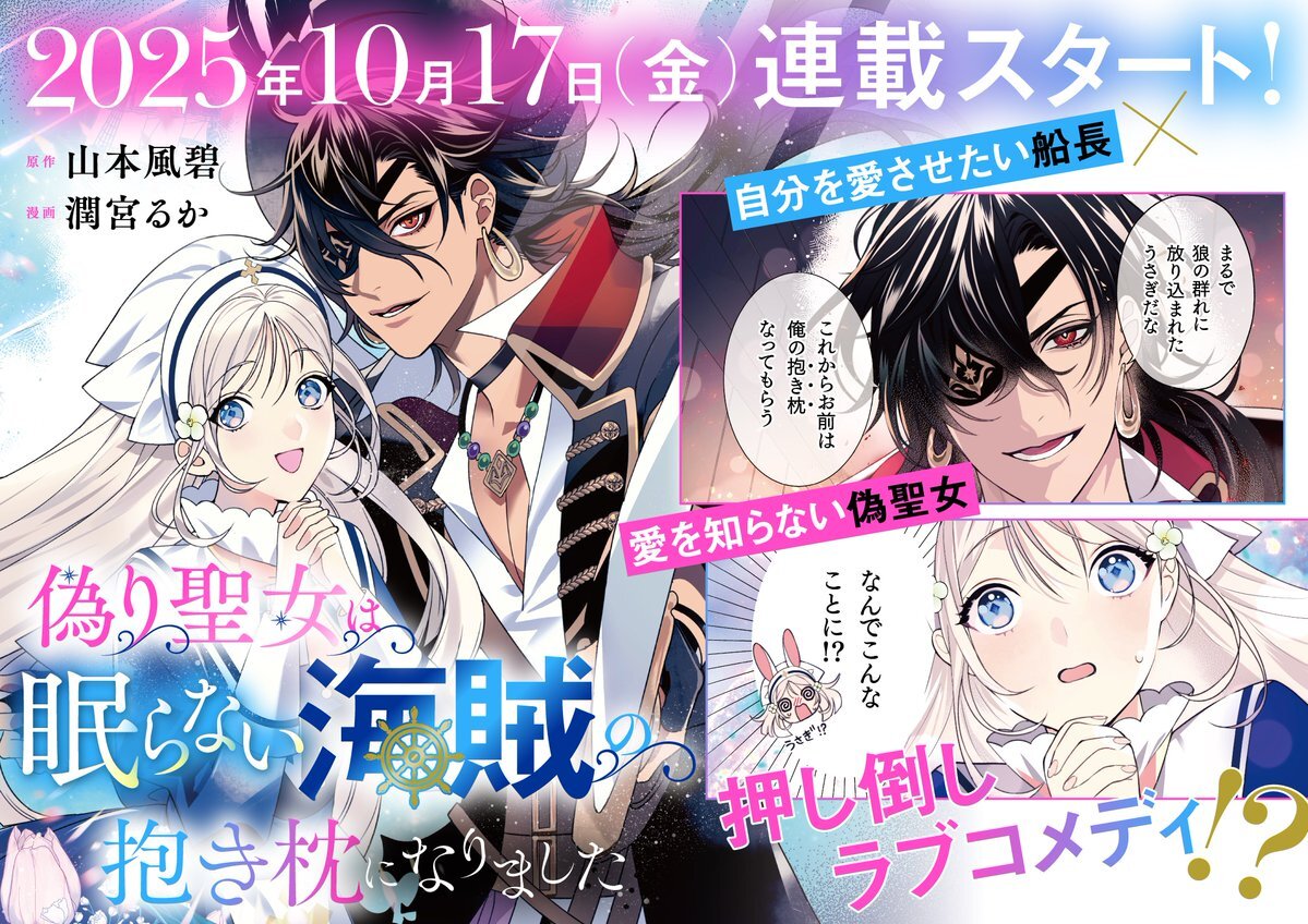こんにちはー! 10月17日(金)から新連載がスタートします✨ 原作は山本風碧先生(@_greenapplegg) 潤宮は漫画を描かせて頂いています☺️ 押し倒したい海賊ヒーロー🐺と 呪いつきの聖女🐰のラブコメです✨ #セイカイ #FlosComic #フロースコミック pic.x.com/Yd9Y0YdKem