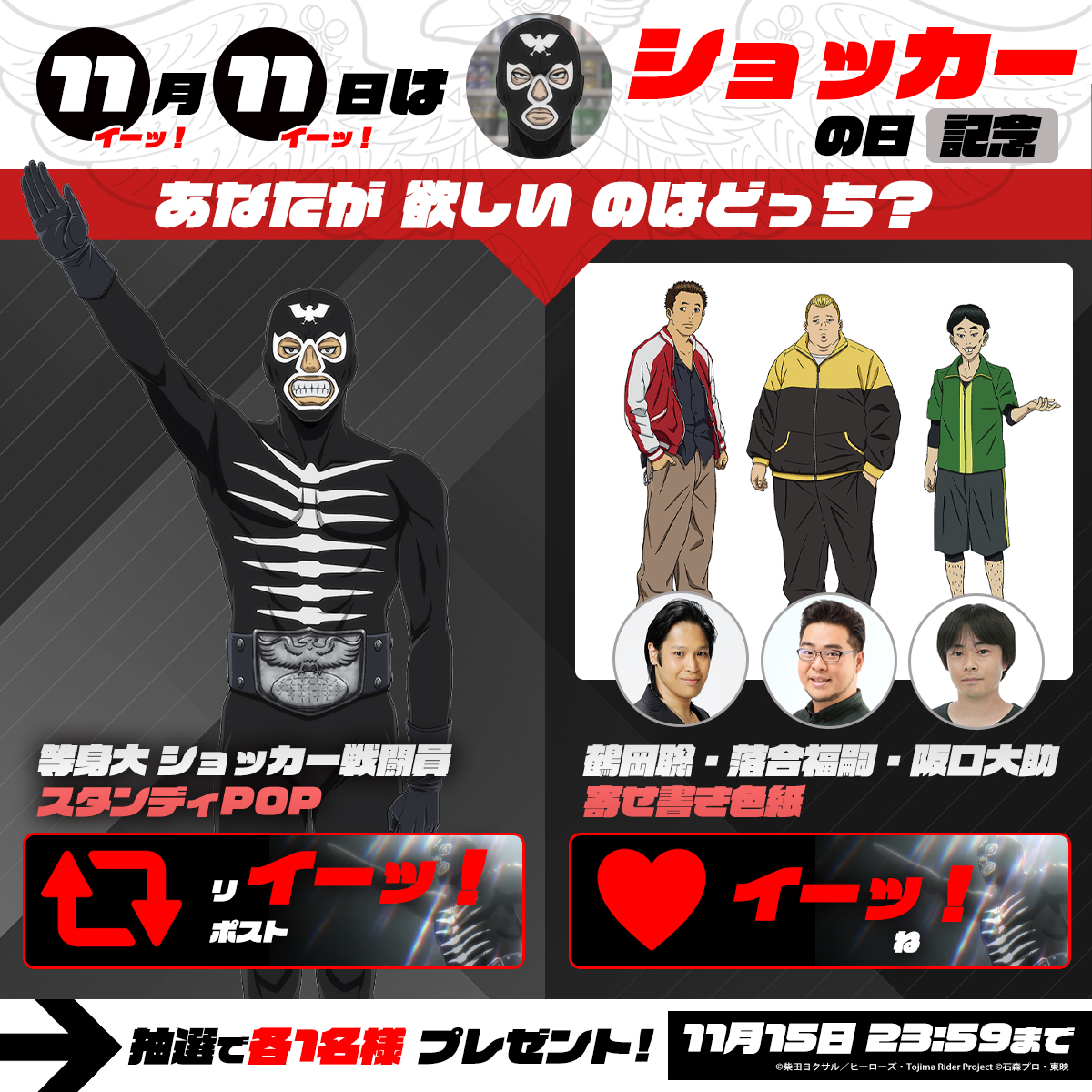 ━━━\_/━━━   #東島ライダー #ショッカー の日記念 ━━◥◣_◢◤━━ 欲しいのはどっち🤔? ┈┈┈┈┈┈┈┈┈┈ ✋️応募方法 1️⃣@tojima_riderをフォロー 2️⃣下から選択 🔴スタンディPOP👉️リ【イーッ!️】ポスト🔁 🟢声優陣色紙👉️【イーッ!️】ね❤️ 📅11/15まで