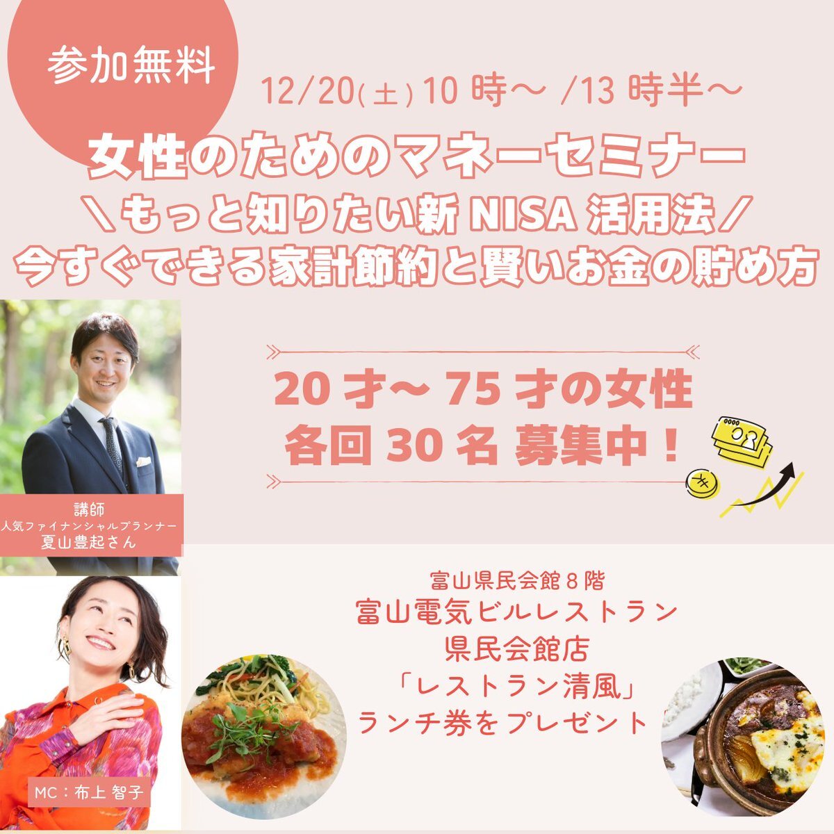 20~75才女性 参加者募集! 📍12/20(土) 10時~/13時半~ 女性のためのマネーセミナー  もっと知りたい新NISA活用法 今すぐできる家計節約と賢いお金の貯め方👛 お友達同士やご夫婦での参加も🆗 富山県民会館「レストラン清風」のランチ券をプレゼント🍽 #FMとやま